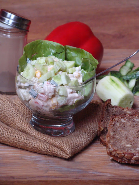 Sałatka zrobiona z tego co zostało z obiadu + coś jeszcze i jak to zwykle bywa wyszło bardzo fajnie, przy sałatkach oczywiście zawsze mamy sporą dowolność bo co nie włożymy do nich to i tak będzie smakować wybornie.