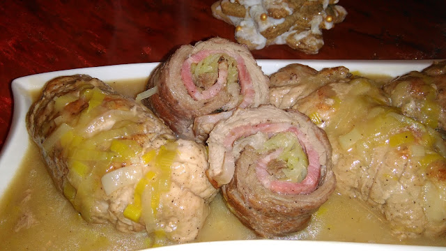 Umyte mięso szynki rozbijamy na cieńsze plastry,solimy,posypujemy pieprzem. Odstawiamy w chłodne miejsce.Tymczasem pory musimy dokładnie umyć,odciąć zielone końcówki. Białe części przekroić wzdłuż na pół, po czym na ukośne kawałki. Na każdym kawałku rozbitego mięsa układamy plaster wędzonego boczku,na nim zaś położyć kawałki pora.Następnie zawijamy mięso w roladki,spinamy wykałaczką bądź obwiązujemy nitką i obsmażamy z każdej strony. Przekładamy roladki do rondelka,dodajemy resztę pora,ziele angielskie,zalewamy piwem i dusimy ok 30-40 min. Pod koniec duszenia roladki wyciągamy,ściągamy nitki,sos doprawiamy sosem sojowym oraz pieprzem. Możemy zagęścić 1 łyżką mąki. Roladki ponownie wkładamy do rondelka i dusimy jeszcze krótką chwilę.