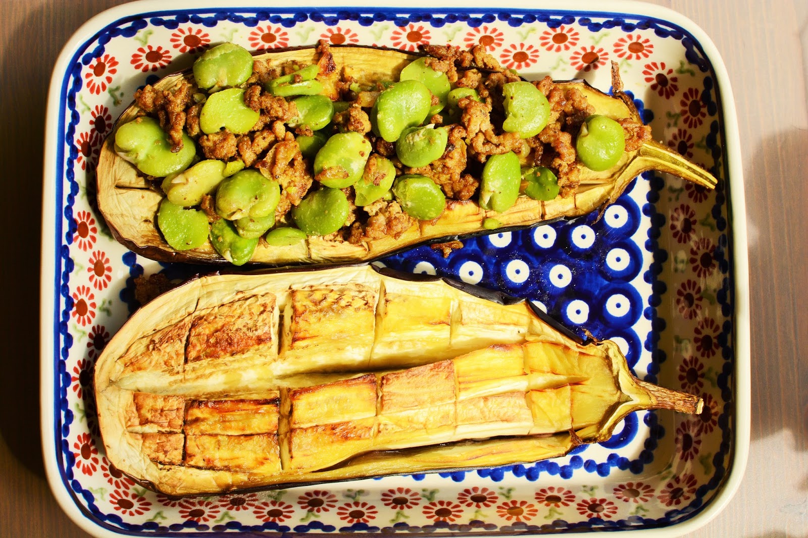 Bakłażany umyć, osuszyć i przekroić wzdłuż na połówki. Przy pomocy małego, ostrego noża ponacinać wnętrza bakłażanów w kratkę, starając się nie przekłuć skórki. Każdą połówkę skropić oliwą z oliwek i lekko posolić. Wstawić do piekarnika nagrzanego do 180 stopni C na około 20 minut, aż miąższ zmięknie. W razie potrzeby pieczenie przedłużyć. Cebulkę pokroić w kostkę i usmażyć na oliwie. Lekko posolić. Dodać mięso, wymieszać i także usmażyć na złoto. Dodać przyprawy i smażyć razem przez chwilę, aż smaki się połączą. Posolić. Do mięsa dodać ugotowany i obrany bób. Wymieszać. Na upieczone bakłażany nałożyć mięsne nadzienie. Podawać na ciepło.