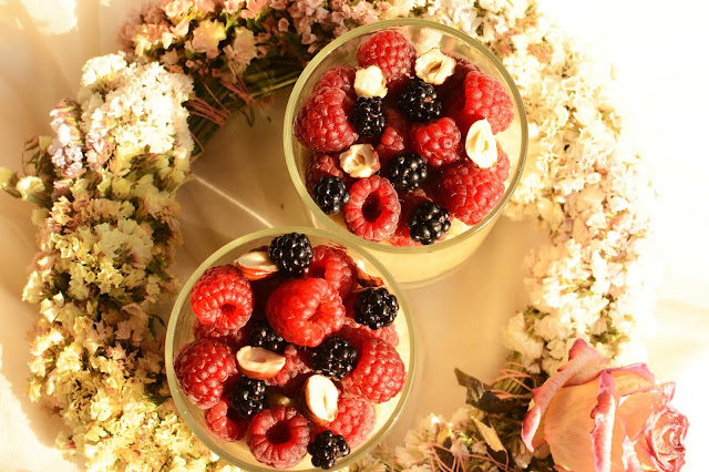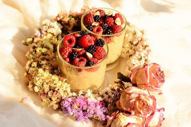 Bananowy pudding z komosy ryżowej na mleku z orzechami i letnimi owocami:
