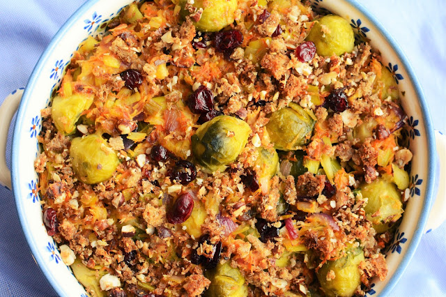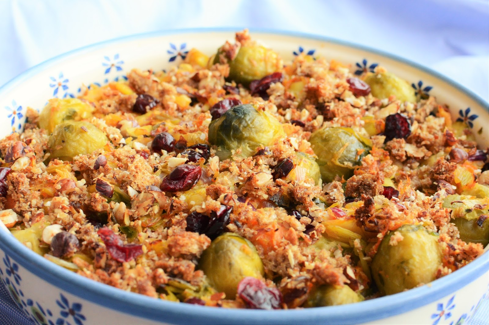 Brukselki w porowym sosie z chrzanem i żurawiną, zapiekane pod orzechowo cytrynową kruszonką: