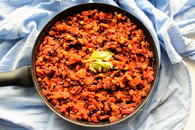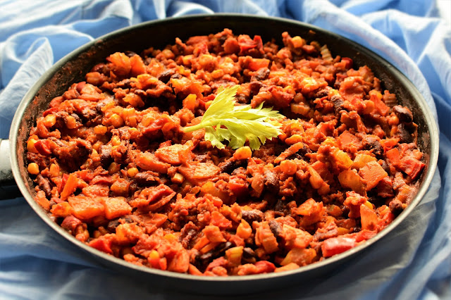 Cebulę, seler, chili i marchew pokroić w drobną kostkę. Usmażyć na oliwie. Lekko posolić. Następnie kiedy warzywa nabiorą lekkiego koloru dodać pokrojoną w kostkę paprykę i granulat sojowy. Fasolę i kukurydzę odcedzić. Fasolę dokładnie wypłukać. Dodać do warzyw. Następnie zalać bulionem i pasattą, dodać przyprawy, poza czosnkiem, przykryć pokrywką i pozostawić na małym ogniu na ok. godzinę, co jakiś czas mieszając. Po tym czasie sos powinien się zagęścić a warzywa powinny być miękkie. Dodać przeciśnięty czosnek, zamieszać i zagotować. Spróbować i w razie potrzeby dosolić. Ilość chilli można zmniejszyć, dobierając ostrość do osobistych preferencji. W razie czego, można zaostrzyć pod sam koniec gotowania. Podawać z ryżem.