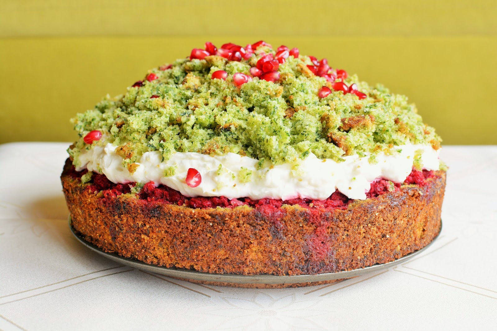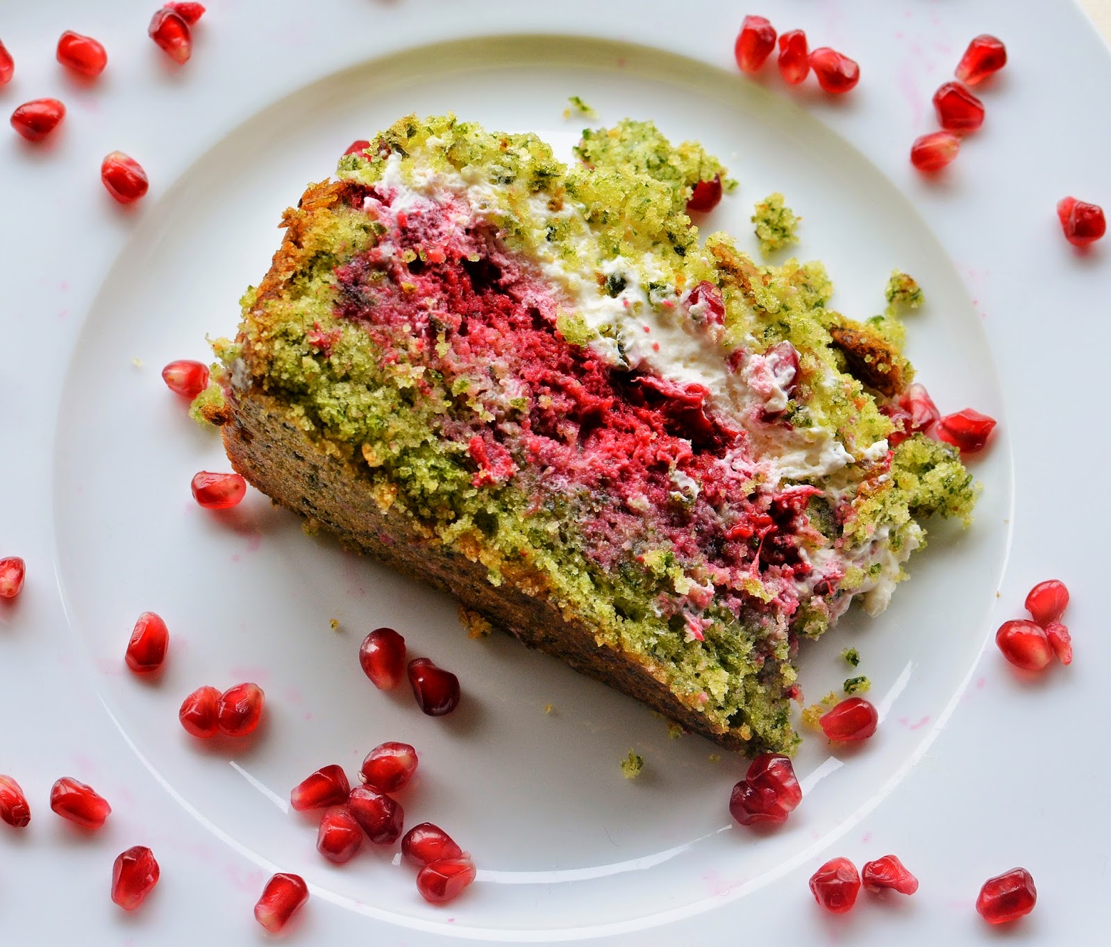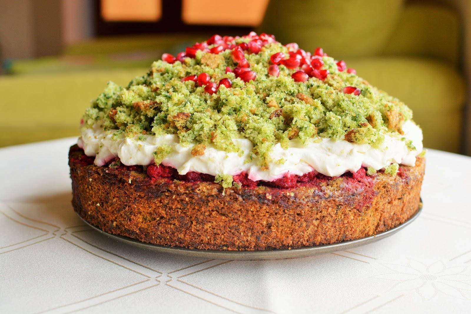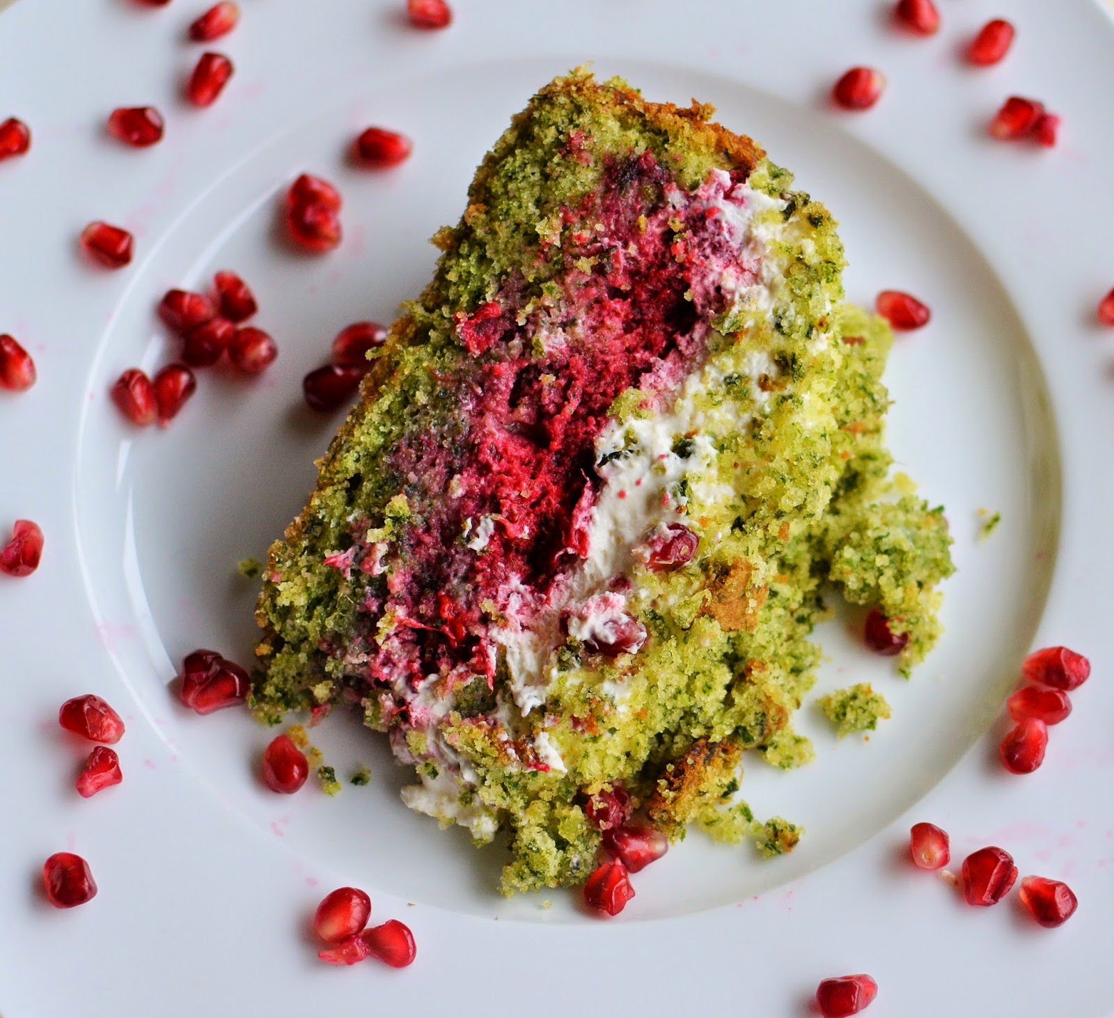 Szpinak odmrozić i dokładnie odcisnąć z soku. Można go położyć na sitku, poczekać aż obcieknie i docisnąć dodatkowo łyżką by pozbyć się reszty płynu. Jajka ubić z cukrem na puszystą masę. Następnie niewielkim strumieniem wlewać do nich olej cały czas mieszając. Mąkę przesiać i połączyć z proszkiem do pieczenia. Wraz z odciśniętym szpinakiem dodać do jaj i dokładnie wymieszać mikserem. Przelać do tortownicy i piec w piekarniku nagrzanym do 180 stopni C przez godzinę. Wyjąć z piekarnika i przestudzić. Mrożone maliny lekko rozmrozić, tak by można je było podzielić widelcem. Z upieczonego ciasta odkroić 1/3, od góry, tym samym wyrównując wierzch. Odcięty fragment pokruszyć na "kruszonkę" i odłożyć do miseczki. Schłodzoną śmietanę lekko ubić. Dodać śmietan fixy i cukry waniliowe, ubić na sztywno. Na ciasto nałożyć mrożone maliny. Na maliny rozsmarować ubitą śmietanę. Posypać "kruszonką" z ciasta. Na wierzchu ciasta posypać ziarna granatu. Schłodzić.