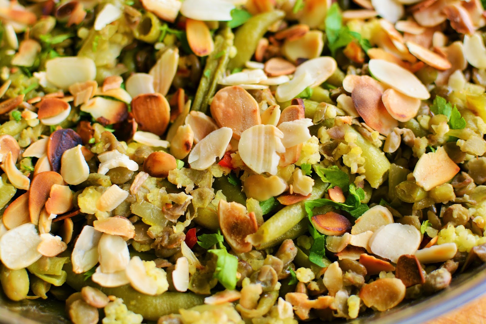 Ciepła sałatka z soczewicą, kaszą jaglaną i migdałami: