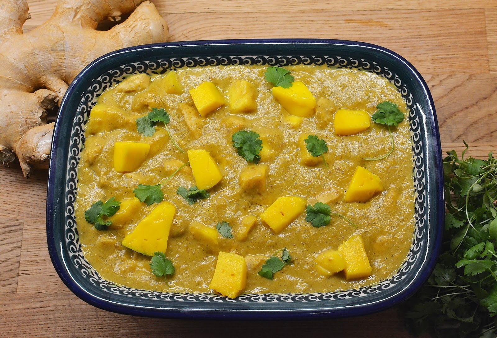 Kurczaka pokroić w kostkę. Cebule pokroić na średniej wielkości kawałki, czosnek obrać, imbir oskrobać ze skórki, 1 mango obrać i pokroić. Wymienione składniki zmiksować na pastę. Kurczaka podsmażyć na oleju kokosowym na złoto. Lekko posolić. Następnie dodać pastę z mango, kurkumę i pastę curry. Wymieszać i smażyć razem przez kilka chwil. Dodać mleko kokosowe, posolić i gotować na niewielkim ogniu. Następnie drugie mango obrać i pokroić w kostkę. Pół mango dodać do sosu, drugie pół zostawić do dekoracji. Przyprawić do smaku. Ryż jaśminowy ugotować zgodnie z instrukcją na opakowaniu. Podawać ryż z sosem, dekorując świeżym mango i kolendrą.