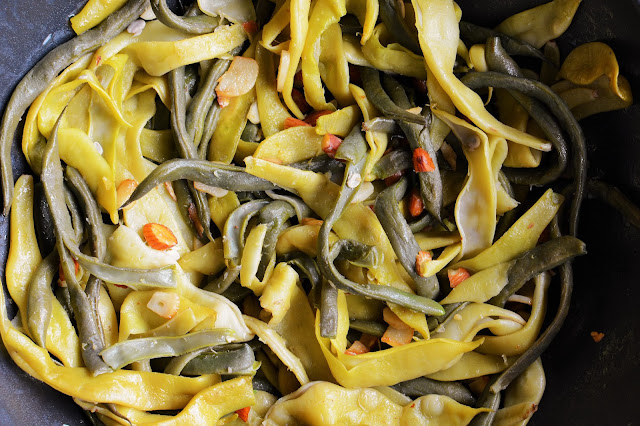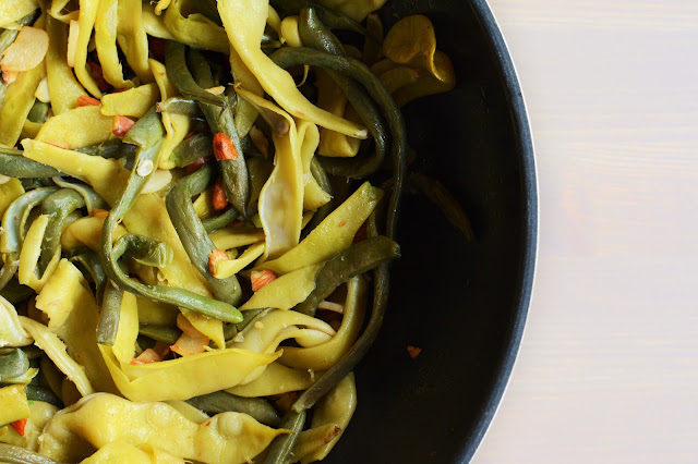Okres kiedy pojawia się pierwsza fasolka szparagowa ma dla mnie wyjątkowe znacznie. Nie tylko bardzo ją lubię, ale także sygnalizuje, że nadciąga fala "dostaw" z ogrodu mojej Mamy. Tak, moja Mama od czasu kiedy prowadzi ogród ma prawdziwe wysypy fasolki szparagowej. I powiem Wam szczerze, że właśnie tą mamową lubię najbardziej.Chyba większość ludzi ją lubi. Zaś ci, którzy twierdzą, że nie bardzo, pewnie mają na myśli fasolkę z łykami. No niestety, takiej to i ja niezbytnio.. Tajemnicą jest by fasolka nie była zbyt duża, przerośnięta. To właśnie od zbyt długiego dyndania na strąkach pojawiają się nieprzyjemne łyka. Fasolka od mojej Mamy jest maślana, cudna, powiedziałabym nawet, że lekko słodka. Myślę, że gdyby była taka możliwość jadłabym ją na surowo.. ale chyba w wersji gotowanej smakuje mi bardziej.Żeby nie powtarzać bez końca tych samych schematów i przepisów, odchodzimy od fasoli okraszonej masłem i bułką tartą. Dziś mam dla Was fasolkę z chrupiącym, aromatycznym czosnkiem i kawałkami migdałów. Proste jak drut, a jakie pyszne..! Doskonałe. Sama byłam zdziwiona efektem końcowym. Ten przepis możecie wykorzystać na wiele sposobów. Z jednej strony możecie potraktować go jako pełnowartościowy posiłek i wciągnąć nosem całą miskę fasolki - pamiętając, że zawiera bardzo dużo roślinnego białka i równocześnie malutko kalorii, albo wykorzystać ją jako dodatek, warzywko czy przystawkę. Jestem pewna, że w każdej wersji będzie Wam równie smakować i że będziecie wracać po więcej.