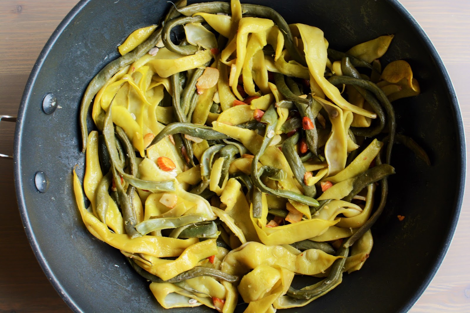 Fasolkę umyć, obrać i ugotować na miękko w mocno osolonej wodzie. Orzechy posiekać na średniej wielkości kawałki, czosnek pokroić w plasterki. Orzechy i czosnek wrzucić na rozgrzaną oliwę i smażyć kilka chwil na średnim ogniu, aż czosnek się lekko zezłoci i zacznie intensywnie pachnieć. Lekko posolić. Uważać, by się nie spalił, bo będzie gorzki. Następnie do orzechów i czosnku dodać ugotowaną i odcedzoną fasolkę. Wymieszać.