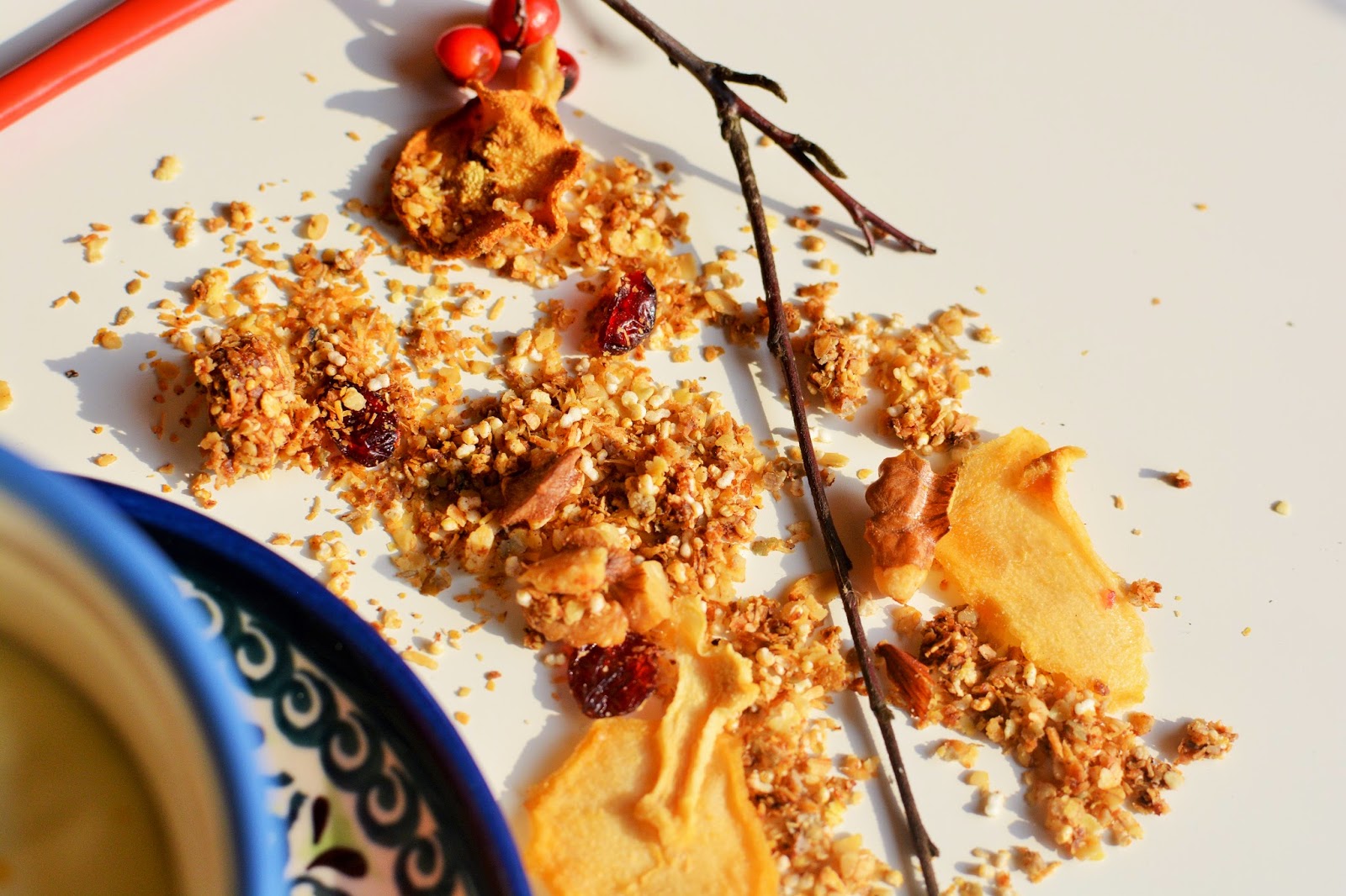 Nie każdy zwraca na to uwagę, ale sklepowa granola zawiera bardzo dużo dodatkowych, niezbyt zdrowych składników. Poza wszechobecnymi konserwantami posiada zwykle bardzo dużo cukru. Nie muszę chyba nikomu tłumaczyć, że z cukrem trzeba ostrożnie.. No niestety, mamy go tak wiele w codziennej diecie, że warto wyostrzyć radary i na przykład śniadaniowe decyzje podejmować z głową. A przecież śniadanie to fundament dnia! Musi być zdrowe, zbilansowane no i oczywiście smaczne. Dlatego zachęcam Was z całych sił do przygotowania swoje własnej, domowej granoli. Smakuje wspaniale, jest aromatyczne i zdrowa. Jeśli nie macie wszystkich składników, nic nie szkodzi. Możecie je dowolnie modyfikować. Zamiast cynamonu możecie dodać odrobinę wanilii, albo kakao. Zamiast gruszek, jabłka. Możecie też zmniejszyć ilość otrąb itd..Próbujcie. Najważniejsze to zrobić pierwszy krok. Jestem pewna, że kiedy spróbujecie już nigdy nie pójdziecie na łatwiznę i nie kupicie wersji sklepowej. Ta własna jest o niebo lepsza!