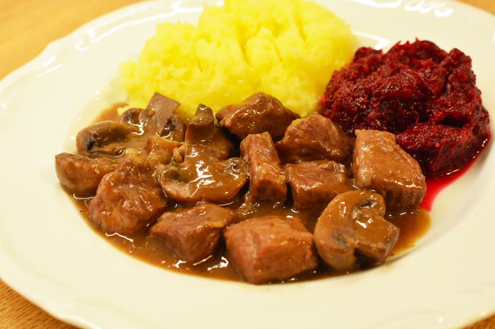 Mięso umyć, osuszyć i pokroić w kostkę. Następnie oprószyć mąką. Na rozgrzanej patelni z niewielką ilością oleju podsmażyć mięso na złoty kolor. Cebulę pokroić w piórka, pieczarki przekroić na połówki. Dodać do podsmażonego mięsa. Po kilku minutach całość zalać winem i bulionem. Dodać słodką paprykę, wymieszać, zmniejszyć ogień i dusić do miękkości. Kiedy mięso zmięknie, a sos się zredukuje doprawić solą i pieprzem do smaku. Podawać z buraczkami i tłuczonymi ziemniakami.