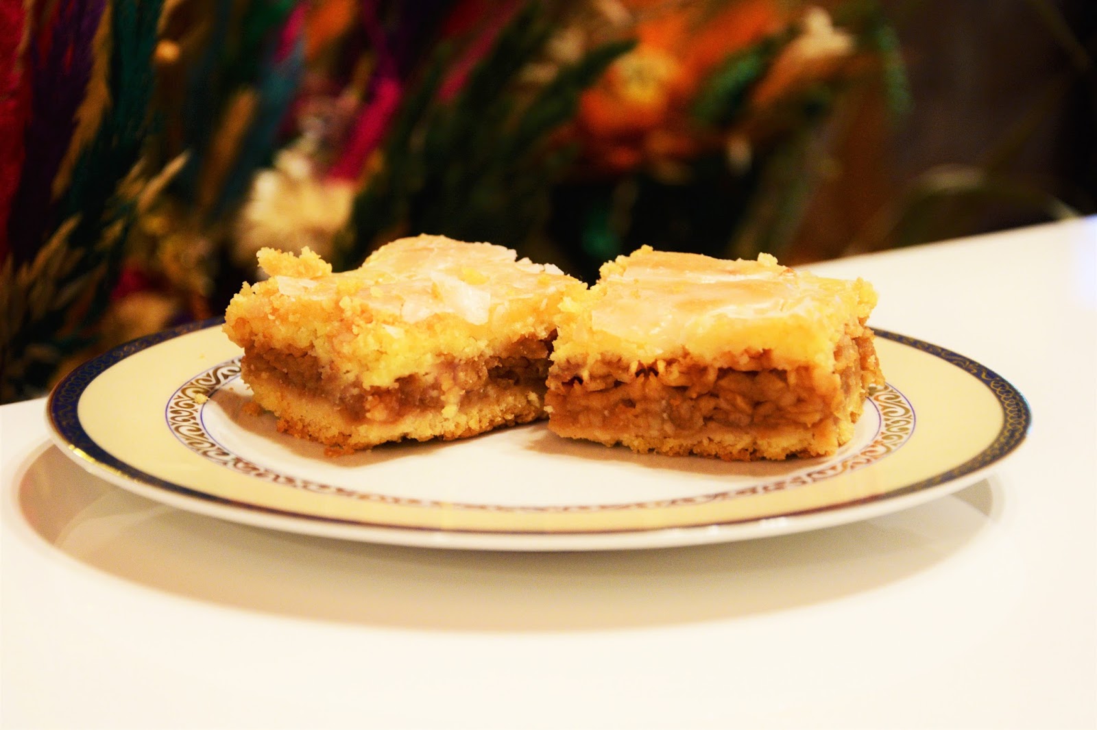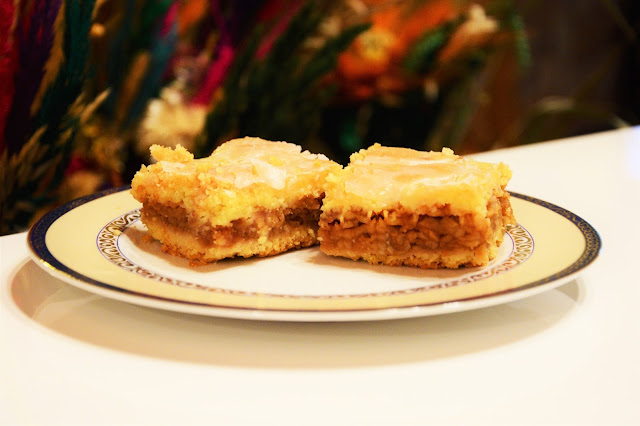 Składniki na ciasto zagnieść i podzielić na dwie części. Każdą część ułożyć na rozłożonej folii kuchennej, formując rulon. Zawinąć ciasno i wstawić do lodówki na około pół godziny. Po tym czasie wyciągnąć jeden rulon i pokroić w plasterki. Plasterki układać na prostokątnej formie do pieczenia, wyłożonej papierem do pieczenia. To będzie stanowiło spód ciasta. Wstawić do piekarnika nagrzanego do 180 stopni C i piec około 15 minut, aż ciasto zrobi się podpieczone, złotawe. Jabłka zetrzeć na tarce o grubych oczkach i wymieszać z cukrami i cynamonem. Spód ciasta wyciągnąć, nałożyć na niego jabłka, po czym na wierzch poukładać krążki z drugiego rulonu ciasta wyciągniętego z lodówki. Wstawić do piekarnika i piec około godziny, aż ciasto będzie widocznie złotawe. Cukier puder na lukier wymieszać z wodą i sokiem z cytryny, tak by powstał mocno gęsty lukier. Tak przygotowany lukier rozłożyć na jeszcze gorącym cieście i pozostawić do wystudzenia.