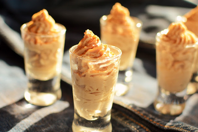 Od jakiegoś czasu poszukiwałam puree z kasztanów.. Miałam ochotę na niewielkie pączuszki nadziewane tym cudownym, słodkim kremem. Obtoczone w cukrze cynamonowym śniły mi się nocami. Ale kiedy już kupiłam słoiczek tego kasztanowego cuda, pomyślałam.. a może by tak lżej?Z tej właśnie idei zrodził się pomysł na kawowy mus z kasztanów. Słodki, ale nie za bardzo. Z niewielką nutą kawy i nieziemsko kremowy..niebo w gębie. Podawany w schłodzonych, niewielkich kieliszkach od wódki stanowi wspaniały i ekscytujący deser. A wszystko zgodnie z zasadą, że jak jest mniej to się bardziej docenia.