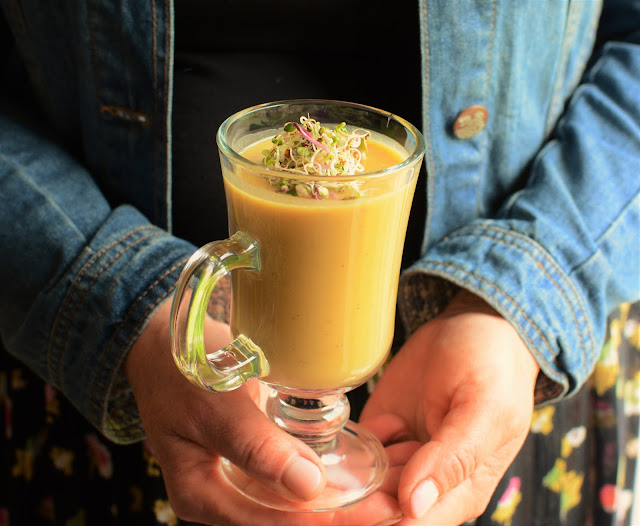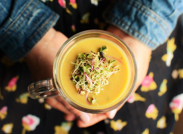 Kilka dni temu robiąc coś w kuchni, usłyszałam w telewizji nazwę Zupa Cappuccino. Ponieważ byłam zajęta, nie zwróciłam specjalnie uwagi na to czym faktycznie owa zupa była, ale nazwa zapadła mi w pamięć. Utkwiła mi w głowie na tyle mocno, że nie mogłam się jej pozbyć. Tak też powstał owy przepis.Jeśli boicie się, że mój krem warzywny cappuccino jest z dodatkiem kawy, to bez obaw. Niewiele ma z nią wspólnego. Jest zaś niezwykle kremowy, puszysty, aromatyczny i lekki jak chmurka. O cudownej barwie kawy z mlekiem smakuje wyśmienicie. Swoją konsystencję zawdzięcza mleku kokosowemu i sporej ilości zmiksowanych warzyw.Jak już jesteśmy przy warzywach zdradzę Wam mój sposób na zdrowe i smaczne zagęszczanie zup, bez wykorzystania śmietany, masła czy mąki. Najprościej i najlepiej zupy zagęszcza się właśnie warzywami. Wystarczy, że gotując zupę warzywną, zmiksujecie tylko jej część, a po dodaniu płynnej części zamieni się ona w aksamitny, smakowity krem. Nikt nie zgadnie, że nie dodaliście mąki czy śmietany. Szczególnie dobrze sprawdza się to kiedy gotujecie kalafior, ziemniaki bądź warzywa strączkowe. Jednakże w każdej innej konfiguracji również będzie super. A przede wszystkim zdrowo i lżej.