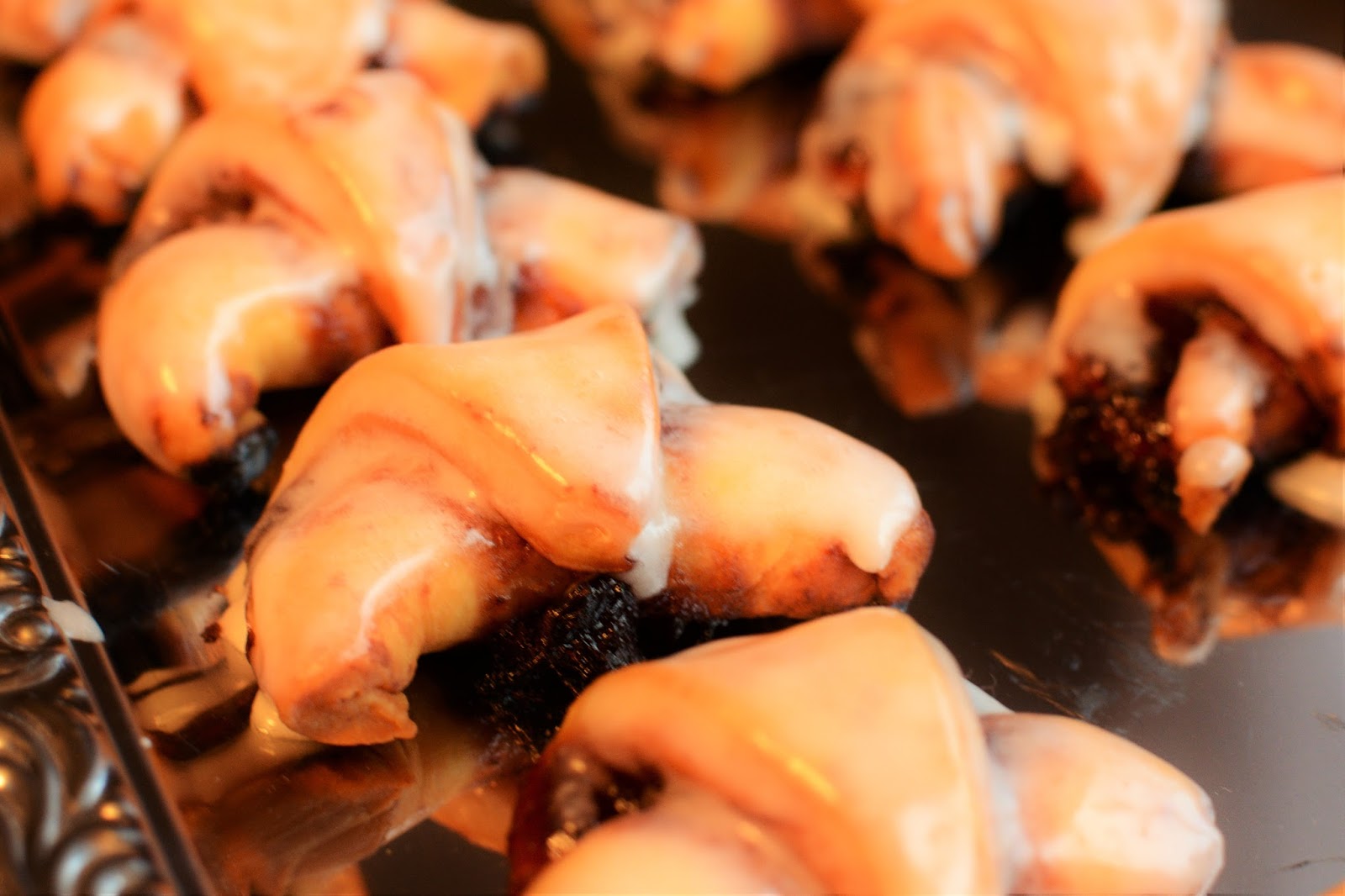 Po upieczeniu rogalików, jeszcze gorące maczamy w lukrze i odstawiamy do ostygnięcia.