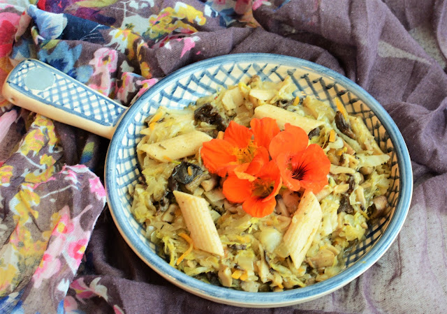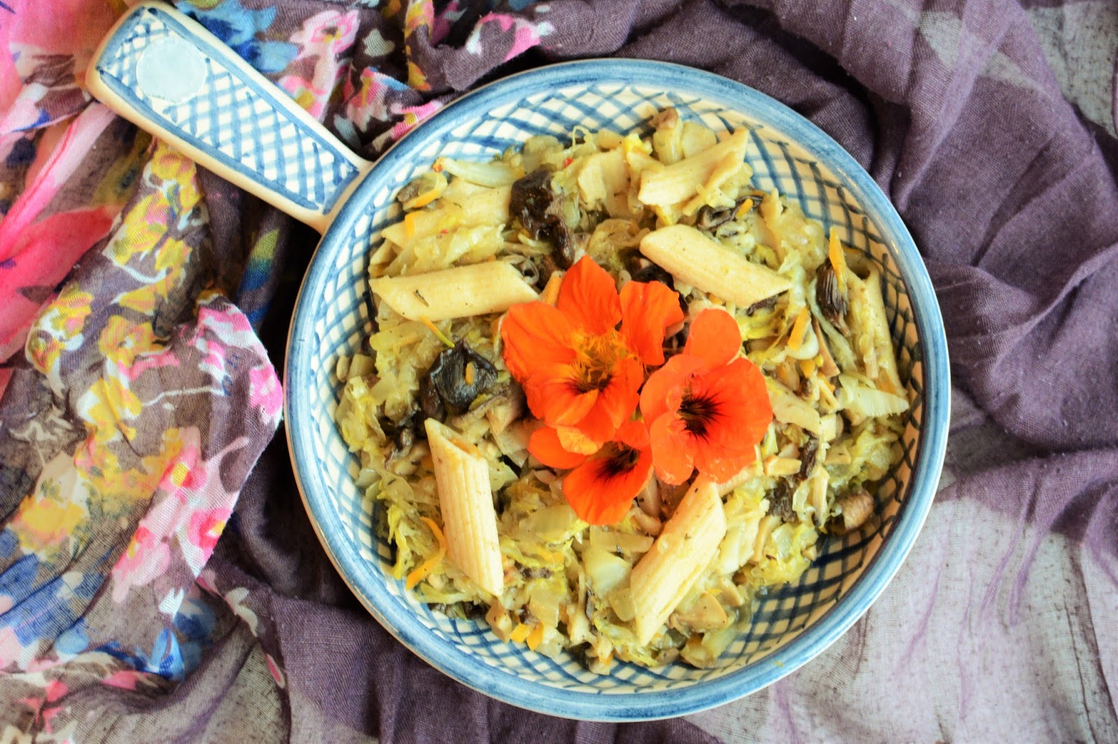 Łazanki z kapustą to jedno z tych dań, do których mam szczególną słabość. Chyba dlatego, że było to jedno z moich pierwszych samodzielnie przygotowanych potraw i napawało mnie ogromną dumą. Faktycznie było smaczne! Dzisiejszy makaron dorównuje mu w pełni, pomimo, że jest wersją zmodyfikowaną. Aromatyczny, smaczny, treściwy. Idealne danie na ziąb i chłód za oknem.Do tego kilka ostatnich już tego roku kwiatów jadalnej nasturcji i szczęście w pełni.