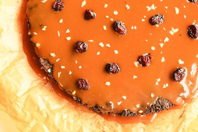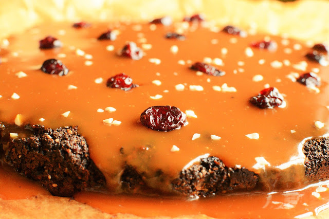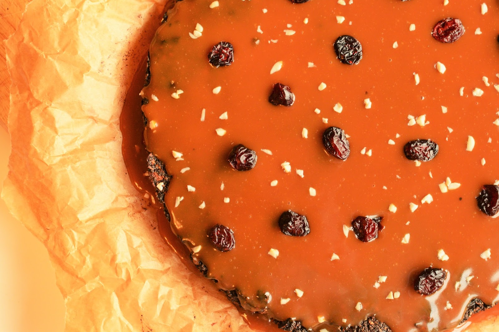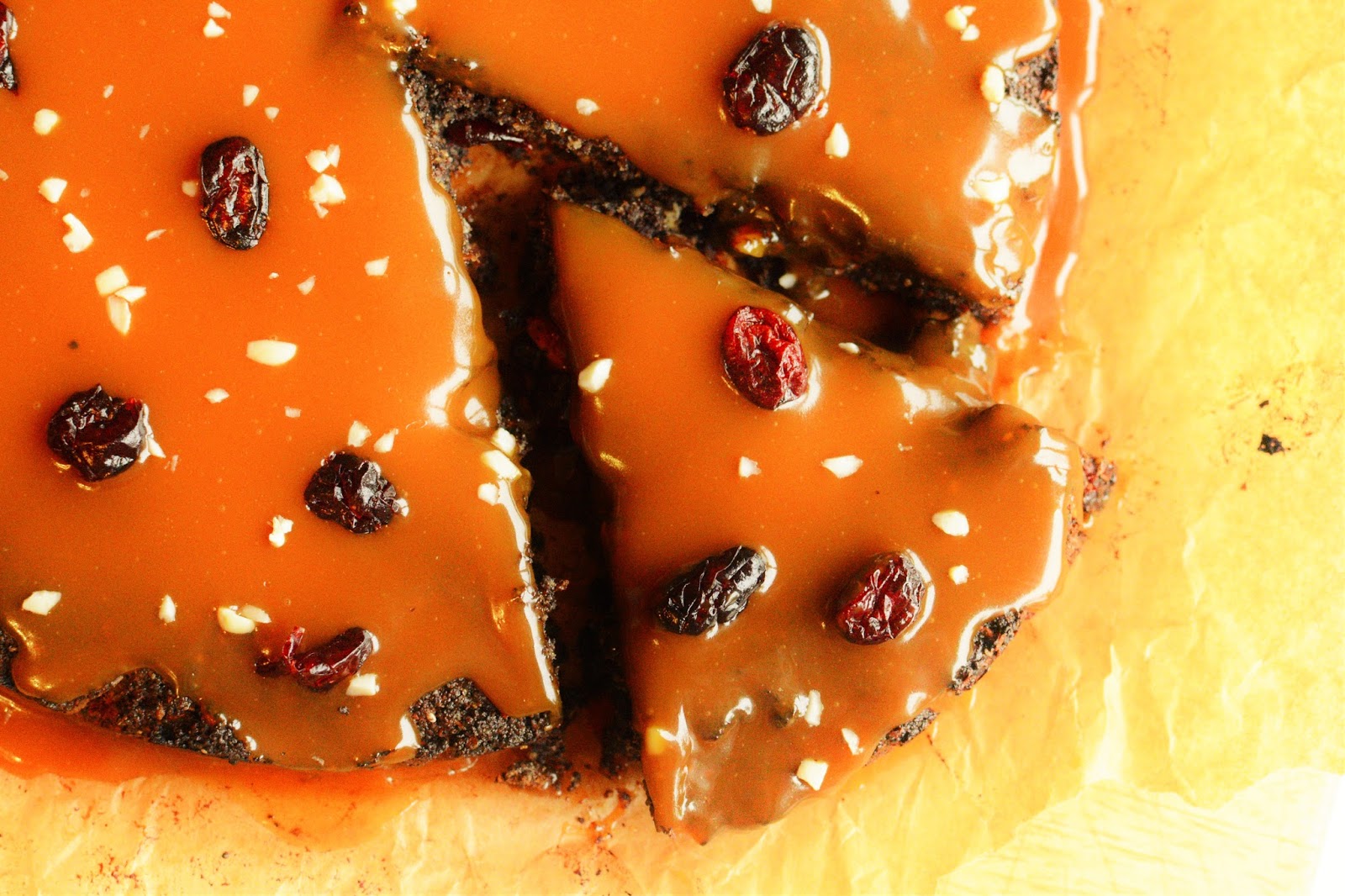 Jajka ubić z cukrem aż staną się białe i puszyste. Dodać mak, posiekane migdały, żurawinę, posiekane drobno śliwki, nasiona chia,posiekaną czekoladę, wiórki, roztopiony olej i nalewkę. Mieszać dokładnie do połączenia składników. Masę wyłożyć na tortownicę z dnem wyłożonym papierem do pieczenia, ugnieść łyżką, by pozbyć się pęcherzyków powietrza i wstawić do piekarnika nagrzanego do 180 stopni C na 35 minut. W miedzy czasie w garnuszku rozpuścić cukier. Wysypać go na dno i nie mieszając poczekać aż się rozpuści i zacznie brązowieć. Kiedy tak się stanie dodać gęstą część mleka kokosowego i dokładnie mieszając gotować na niewielkim ogniu, aż sos będzie gęsty, jednolity i kremowy. Po przygotowaniu, wyłączyć go i przestudzić.