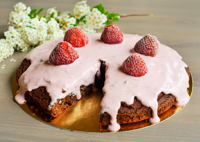 A na moim stole magiczne ciasto. Bez cukru, tłuszczu i mąki - samo zdrowie. A jakże pyszne! Idealne do świętowania. Dzięki cieciorce, ciasto jest sycące i treściwe, lekko wilgotne w środku i mocno czekoladowe. Polewa ze świeżych truskawek dodaje mu gracji i lekkości. Wspaniałe!Polecam Wam serdecznie, rozpieszczajcie swoje Mamy bo warto! Wszystkie są wyjątkowe!