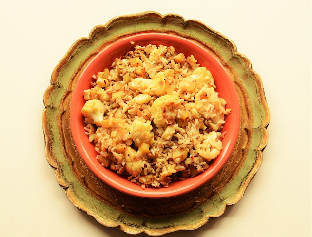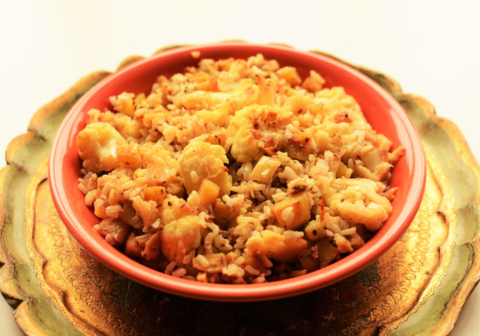 W moździerzu utrzeć kardamon, kumin, gorczycę i chilli, tak aby je dość mocno rozdrobnić. Czosnek i imbir zetrzeć na drobnych oczkach, cebule pokroić w kostkę. Na suchą patelnię wrzucić przyprawy z moździerza i pozwolić by się lekko przyrumieniły i wydobyły aromat. Dodać imbir i czosnek oraz dwie łyżki oleju kokosowego. Dodać cebulę, wymieszać i smażyć chwilę. Następnie dodać kalafior rozdrobniony na niewielkie, równej wielkości kawałki oraz ziemniaki obrane i pokrojone w niewielką kostkę. Wymieszać, posolić i smażyć aż warzywa będą nie tylko przyrumienione ale i miękkie. Dodać asafetydę, wymieszać i smażyć jeszcze chwilę. Dodać ryż i podawać.