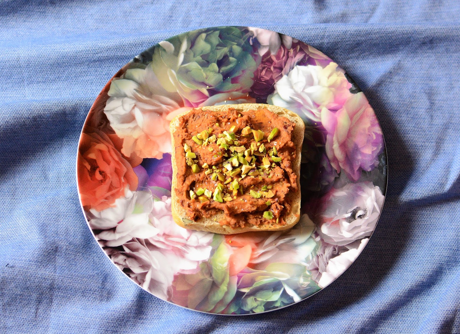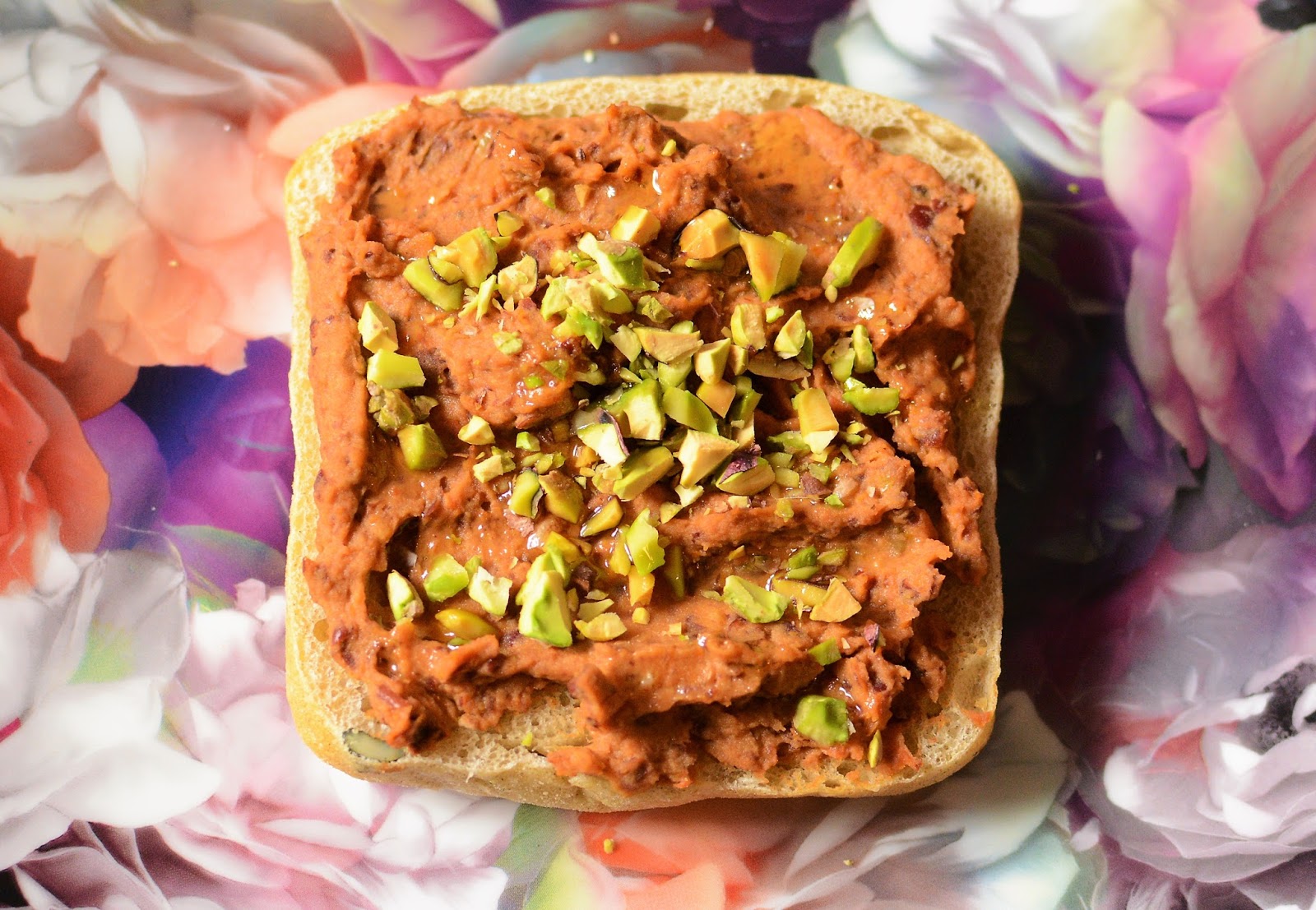 Pomidory odsączyć z oleju. Fasolę odcedzić, dokładnie przepłukać pod bieżącą wodą. W malakserze połączyć pomidory, fasolę, czosnek, oliwę z chilli i sól. Zmiksować na gładką masę. Podawać na chlebie i posypywać siekanymi pistacjami.