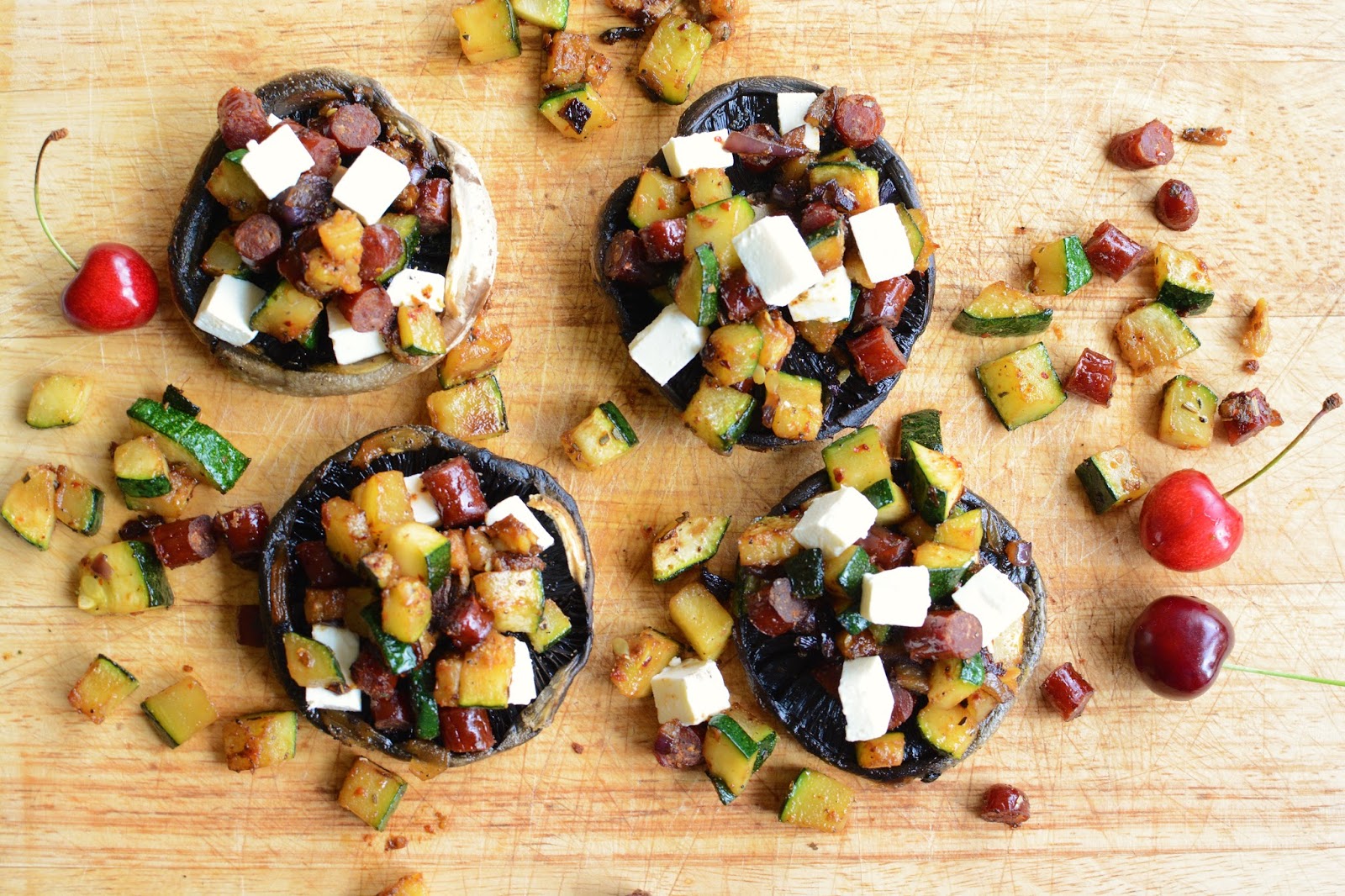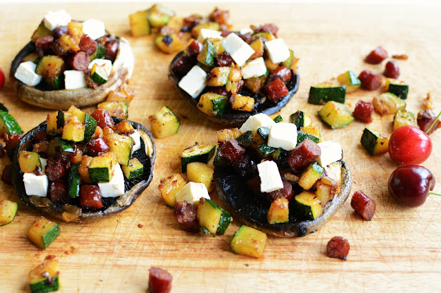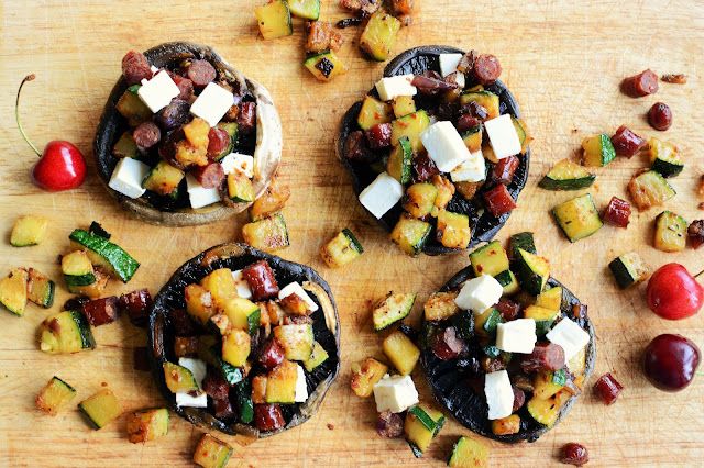 Pieczarki nadziewane cukinią, kabanosami i fetą: