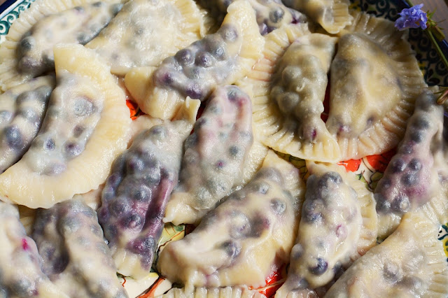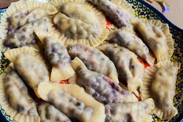 Mój mąż uwielbia pierogi. W szczególności ruskie, choć owocowym również nie mógł by się oprzeć. Fajnie patrzeć jak cieszy się jak dziecko, brudząc sobie usta i palce jagodami. To właśnie kolejny powód dla którego lubię jeść pierogi z jagodami. Można się porządnie wybrudzić. Bezkarnie, radośnie. To taki powrót do dzieciństwa. Bardzo bardzo przyjemne uczucie.