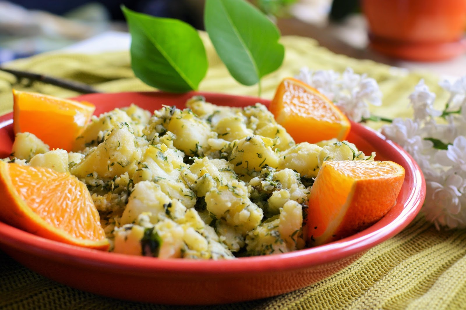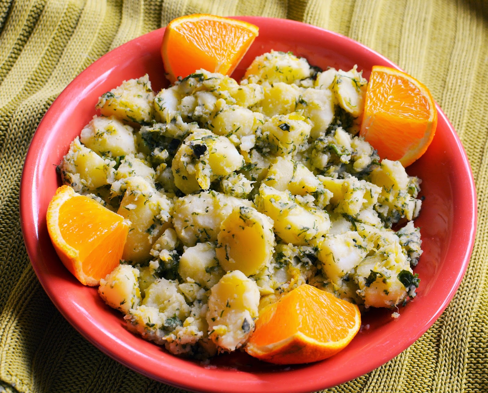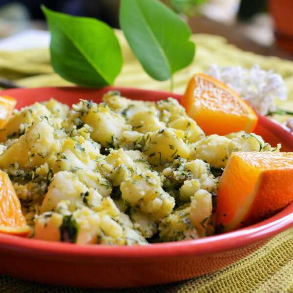 Ugotowane ziemniaki pokroić w średniej wielkości kostkę. W moździerzu ugnieść liście mięty i melisy z oliwą z oliwek, miodem i solą. Pomarańczę przekroić na pół i wycisnąć sok razem z miąższem. Oliwę z miętą dodać do ziemniaczków. Następnie dodać sok z miąższem z pomarańczy. Wymieszać, przyprawić świeżo mielonym pieprzem. Podawać na ciepło lub na zimno.