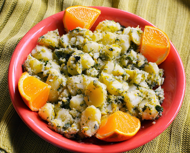 Ziemniaczki z dodatkiem świeżych ziół, pomarańczy, miodu.. to jest coś! Smakują podobnie, ale inaczej. Nie są intensywne, ale wystarczająco doprawione, aby zachwycić najbardziej wybrednego smakosza. Tym razem wykorzystałam zapas ugotowanych ziemniaków z dnia poprzedniego. Szkoda je wyrzucać. Zamiast podsmażać na patelni, można je "odświeżyć" właśnie łącząc z ziołami. Nie są słodkie. Miód jedynie podkreślił miętę i pomarańczę. Bardziej zaromatyzował niż zdominował danie.