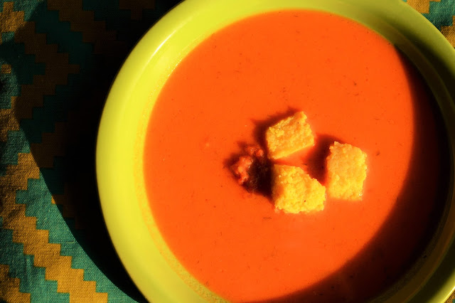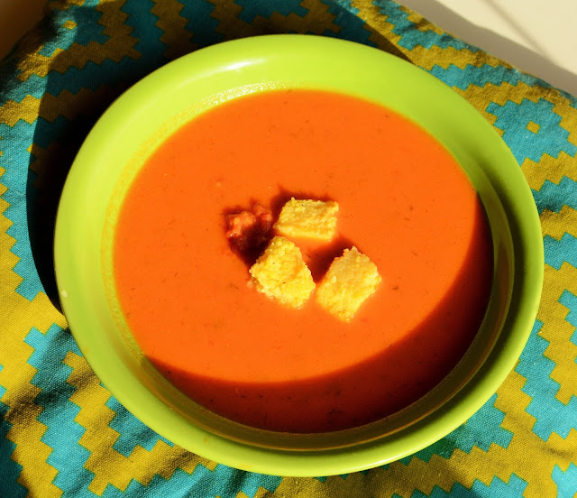 Pomidorowa z mlekiem kokosowym i kostką z kaszy kukurydzianej:
