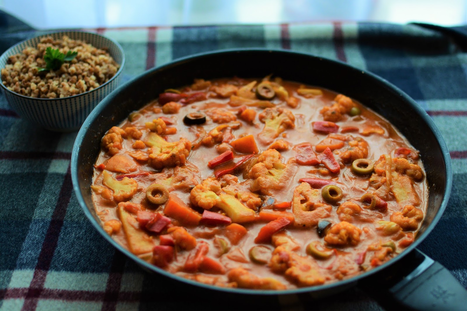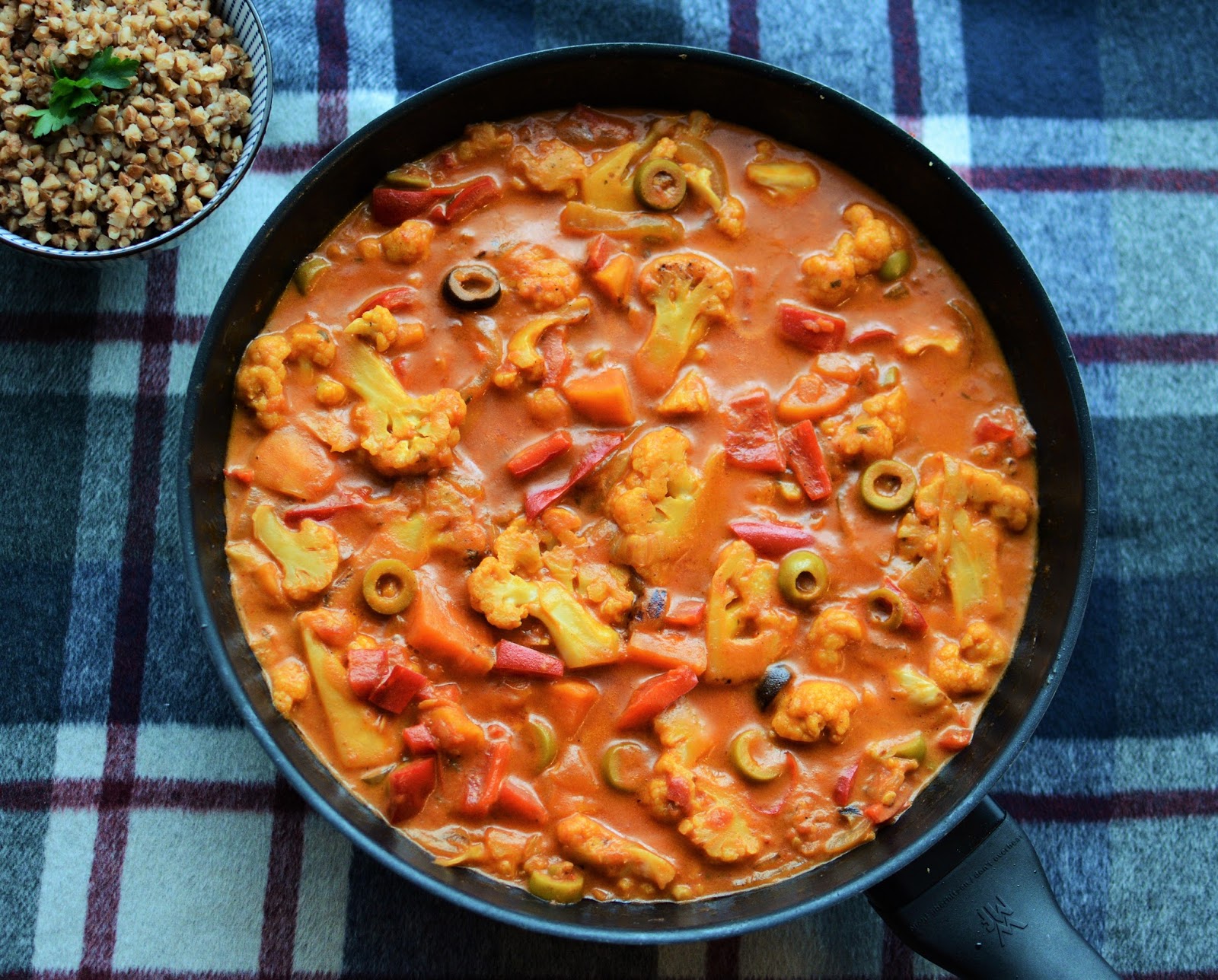 Cebulę pokroić w piórka, batata obrać i pokroić w kostkę. Umytego kalafiora pokroić w plastry. Na patelni rozgrzać oliwę i wrzucić cebulę z batatem. Smażyć razem chwilę, lekko posolić. Dodać kalafior. Smażyć aż warzywa zaczną nabierać brązowych brzegów i się wyraźnie podsmażą. Dodać pokrojoną w kostkę czerwoną paprykę i pokrojone w plasterki oliwki. Wymieszać. Zalać mlekiem kokosowym. Dusić kilka minut pop przykryciem, aż warzywa będą al dente. Następnie dodać pomidory, ostry sos i sól do smaku. Wymieszać, gotować chwilę, by sos lekko zgęstniał. Kiedy warzywa będą miękkie a sos kremowy, doprawić do smaku większą ilością soli bądź chilli. Podawać z kaszą lub ryżem.