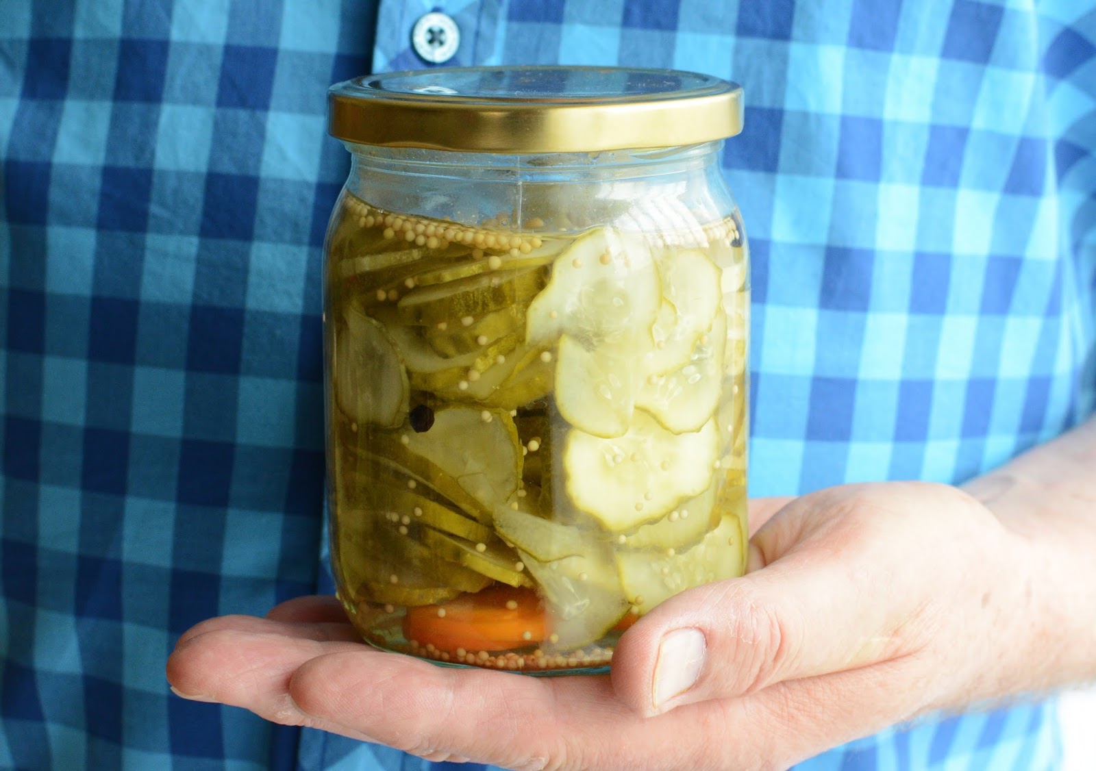 Ogórki dokładnie umyć, obciąć końcówki i pokroić w cienkie plasterki. 9 szklanek wody wymieszać z solą i tak przygotowanym roztworem zalać pokrojone ogórki. Ważne by były całkiem zakryte płynem. Pozostawić zalane przez 3 godziny, następnie odcedzić. Przygotować wyparzone słoiki. Do każdego słoika włożyć ogórki oraz po dwa ziarna ziela angielskiego, dwa pieprzu oraz pół łyżeczki gorczycy. Do każdego słoika wsadzić także po dwa plasterki marchwi. Zalewę zagotować i gorącą zalewać ogórki. Zakręcać i pasteryzować. 8 minut w garnku lub około 20 w piekarniku nagrzanym do 100 stopni C.