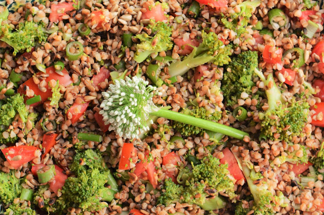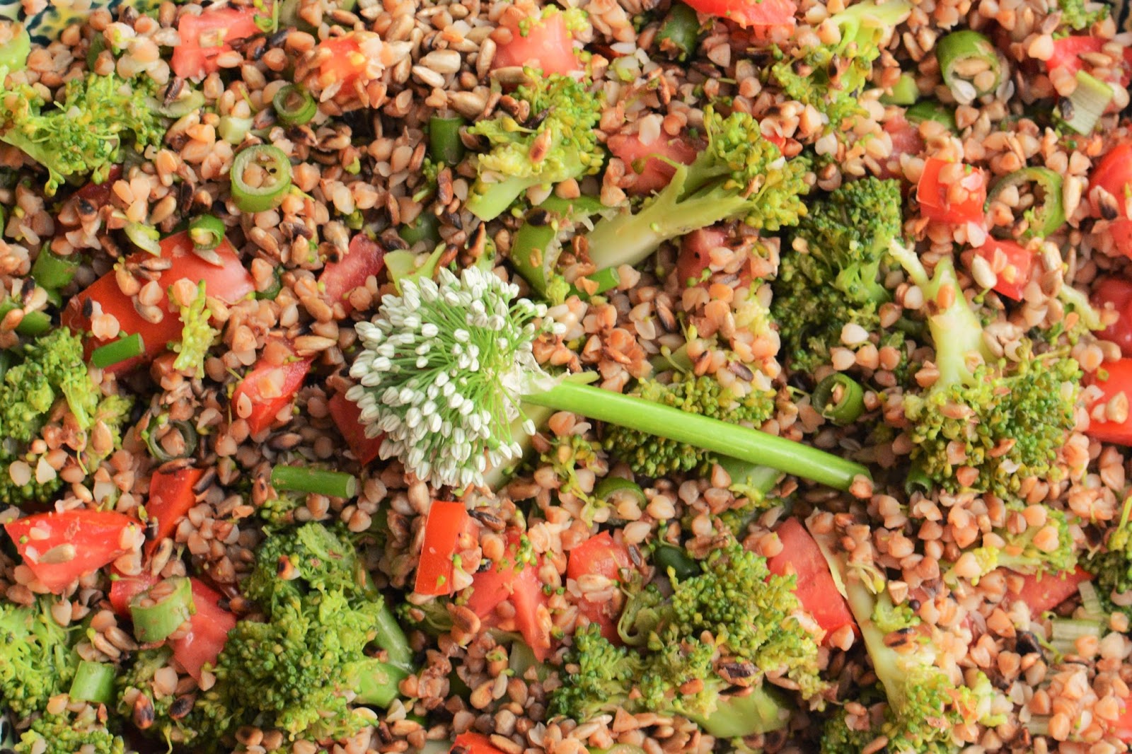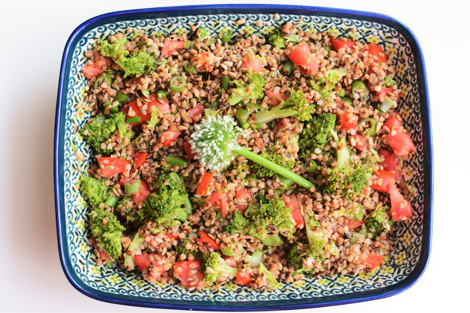 Moja dzisiejsza sałatka mogłaby się nazywać śniadaniowa, gdyż wsunęłam ją na śniadanie. Oczywiście nie całą, ale z wielką przyjemnością. Miałam trochę dość jaglanki z owocami, tostów z miodem czy też kanapek z hummusem. Przyszła porę na moje ukochane kasze. Kasza gryczana zdecydowanie zalicza się do tych bardziej ulubionych, jeśli nie naj. Dzięki temu, że gotuje się szybko (15 minut w zestawieniu z brązowym ryżem, który gotuje się 40 to pikuś! ) nie potrzebujemy dużo czasu na jej przygotowanie. Cudne, super zdrowe i jędrne brokuły, soczysty, słodki pomidor i orzechowy słonecznik i chrupiący szczypior to raj. Raj na talerzu.