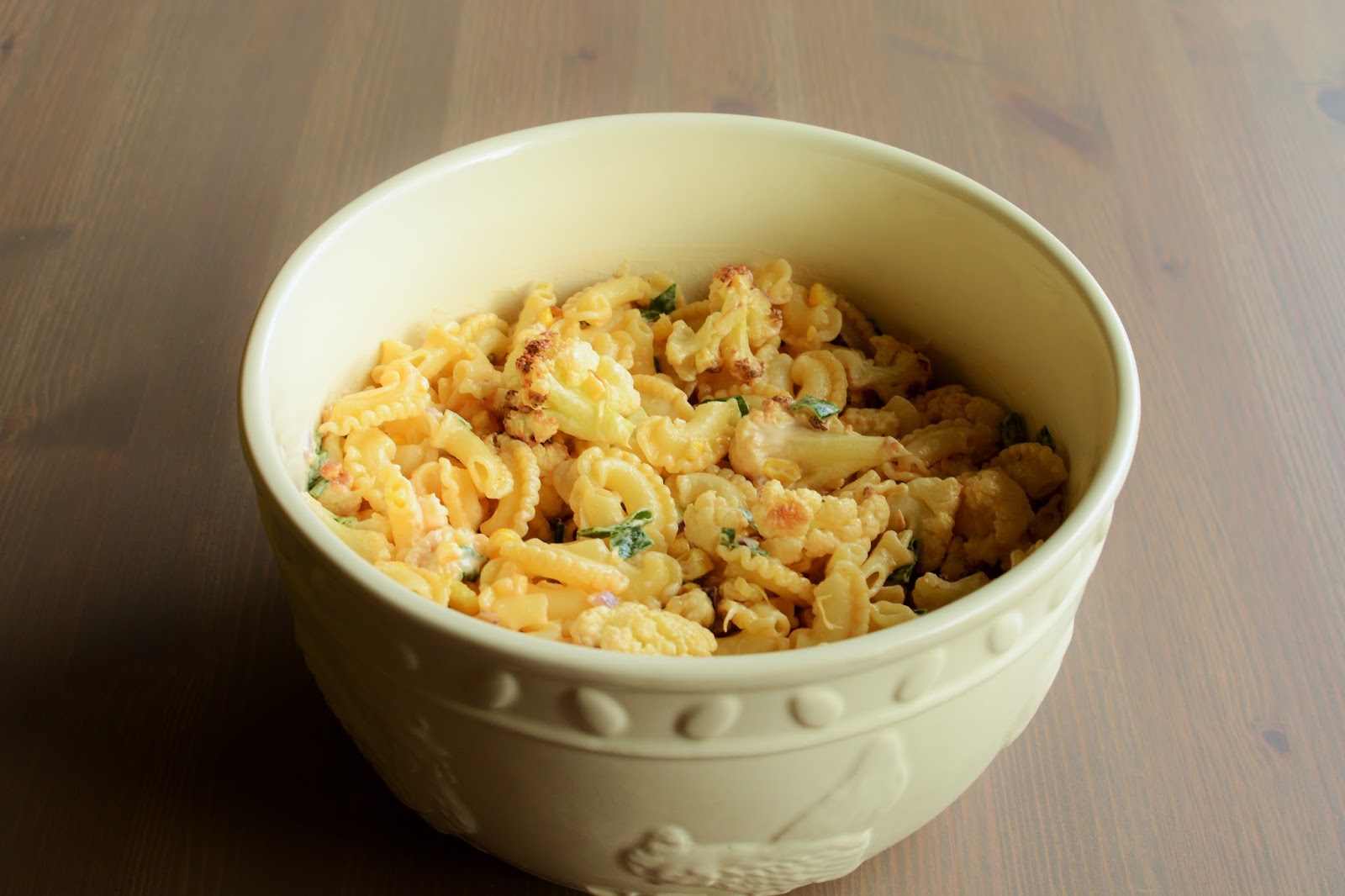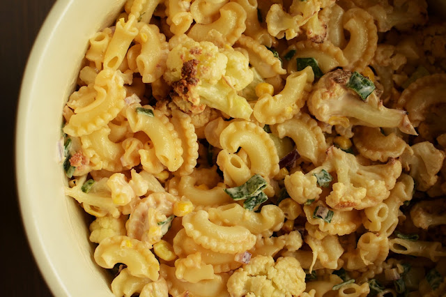 Przyszły ciepłe dni więc sezon grillowy w rozkwicie. Poza mięskiem i warzywami z grilla warto pamiętać o smakowitych dodatkach. Jeśli chodzi o mnie, to nie wyobrażam sobie grilla bez sałatki greckiej, ale lubię też czasem zaimprowizować. Z mojej dzisiejszej improwizacji powstała bardzo smaczna sałatka z pieczonego kalafiora i kukurydzy z makaronem. Rzadko kiedy dodaję makaron do sałatek. Może dlatego, że w większości przypadków uważam, że w warzywach jest wystarczająco dużo smaku, by je dodatkowo przygłuszczać makaronem. Jednak dziś miałam na niego wyjątkową ochotę. Pewnie miała na to wpływ moja nowa zdobycz - kulinarna biblia The Silver Spoon. Och, jak jestem zakochana w tej książce. Nie dość, że ta wielka, opasła księga jest przepięknie wydana to jeszcze w dodatku zawiera chyba wszystkie możliwe pozycje z kuchni włoskiej. A jak kuchnia włoska to oczywiście makaron. No, nie dało się przed nim uciec.Pomimo, że moja dzisiejsza sałatka na grilla nie jest przepisem zaczerpniętym z tej książki, gdzieś w podświadomości usłyszałam głos, który bez większego wysiłku namówił mnie na wykorzystanie makaronu. Wyszło bardzo fajnie. Delikatne makaronowe kolanka są tak urocze, że mogłabym patrzeć na nie godzinami. Też tak macie, że fascynujecie się super kształtami jedzenia?U mnie było tak od zawsze. Malutkie patisony, fikuśny makaron ( a jest go milion odmian), śmieszne, nie do końca wyrośnięte marchewki.. Wszystkie je kocham!
