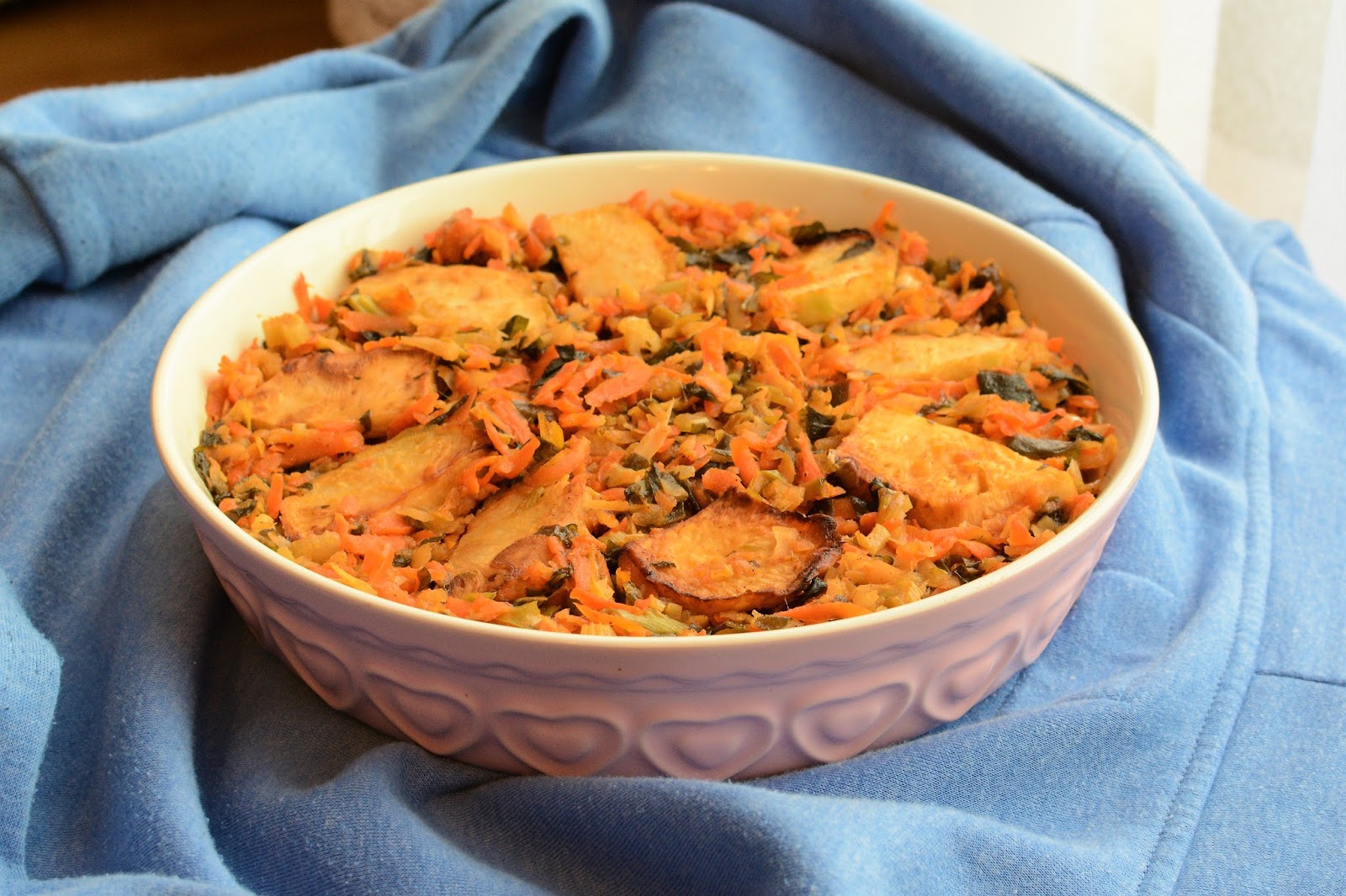 Seler obrać, umyć i pokroić w plastry grubości 2 cm. Następnie każdy plaster przekroić na połówkę. W garnuszku zagotować wodę z bulionem, dodać glony i seler. Gotować kilka minut do miękkości. Kolejno przelać przez sito, zachowując płyn. Odcedzony seler oddzielić od glonów i usmażyć na złoto na rozgrzanej patelni, z obu stron. Odłożyć na bok. Warzywa umyć i obrać. Pietruszkę i marchew zetrzeć na tarce o grubych oczkach, por i seler naciowy pokroić w cienkie plasterki. Na olej, który pozostał po smażeniu selera dodać por i selera. Smażyć chwilkę. Następnie dodać starte warzywa. Zamieszać, dodać sos sojowy, pieprz, paprykę i sól. Smażyć kilka minut. Kolejno dodać pokrojone glony, które zostały nam z gotowania selera, ketchup oraz cały płyn, który pozostał po odcedzeniu bulw. Wymieszać i pozostawić na ogniu co jakiś czas mieszając, tak długo, aż płyn w większości się zredukuje a warzywa będą aromatyczne i miękkie. Na półmisku układać : warstwa warzyw, seler, warzywa, seler, warzywa. Przed podaniem schłodzić.