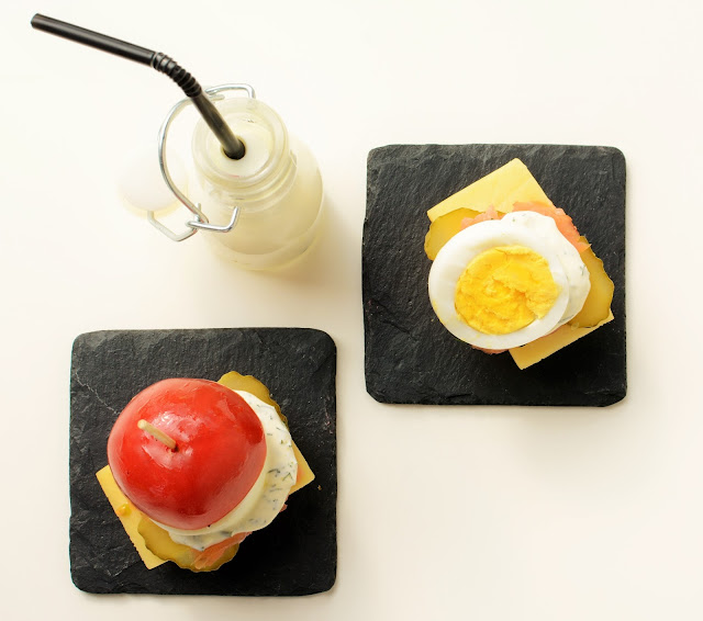 Śniadaniowe burgery pomidorowe z wędzonym łososiem, jajkiem i jogurtowym sosem koperkowym: