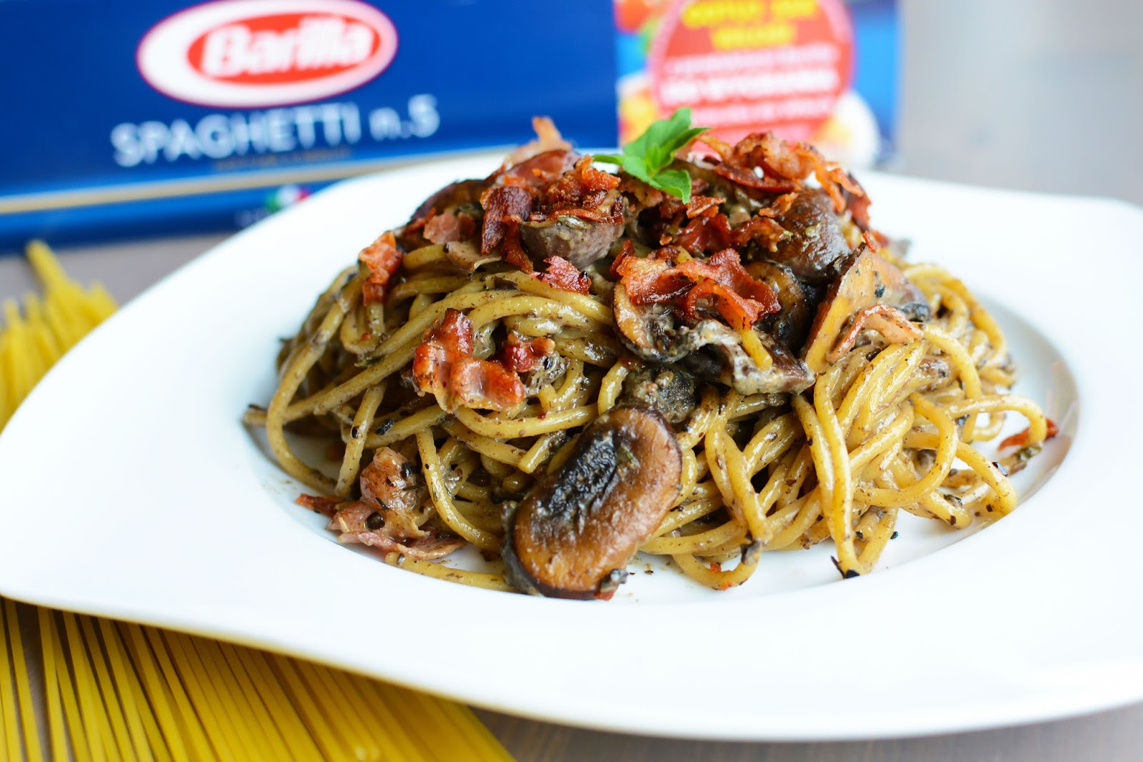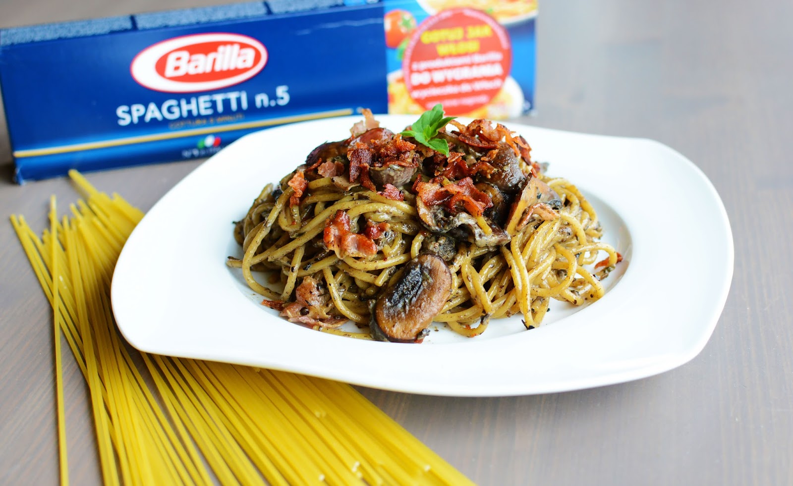 -200 gramów makaronu Barilla spaghetti- 150 gramów pancetty- 150 gramów grzybów portabello- 2 garści suszonych prawdziwków- 2 łyżki śmietany 20%- 2 ząbki czosnku- 1 łyżeczka świeżego tymianku- 250 ml bulionu drobiowego- 0,5 łyżeczki świeżo mielonego pieprzu- oliwa z oliwek- 1 łyżeczka masła- sólW dużym garnku gotujemy wodę, następnie solimy. Wkładamy spaghetti i gotujemy ok. 5 minut krócej niż wskazuje opakowanie. Na patelni rozgrzewamy oliwę z oliwek, następnie kładziemy na niej plastry pancetty. Smażymy z każdej strony aż będzie mocno przypieczona i znacząco się skurczy. Odkładamy na ręcznik papierowy do odsączenia. Do oliwy dodajemy 2 ząbki czosnku w całości i pokrojone w plastry grzyby portabello. Najlepiej podzielić je na dwie części i dodawać do oliwy stopniowo, tak aby były złociste i nie puściły wody. Kiedy grzyby będą ładnie usmażone wyciągamy czosnek, dodajmy niewielką ilość soli, pieprzu i tymianek. Suszone grzyby mielimy na puder, lub ucieramy dokładnie w moździerzu. Tak przygotowany puder dodajemy na patelnię. Następnie do grzybów dodajemy wywar drobiowy i na dość dużym ogniu gotujemy aż się w większości zredukuje. Do kubeczka odlewamy kilka łyżek płynu i w nim hartujemy śmietanę. Rozmieszaną śmietanę dodajemy na patelnię i zmniejszamy ogień. Z garnka ze spaghetti odlewamy ok. 40 ml wody po makaronie i dodajemy na patelnię. Całość sosu powinna się zredukować i stać się jedwabista. Następnie odcedzamy makaron, przekładamy do grzybów, dokładnie mieszamy i pozostawiamy na średnim ogniu przez kilka dodatkowych minut. Na sam koniec do makaronu dodajemy łyżeczkę masła, by całość stała się błyszcząca i jednolita. Do tak przygotowanego makaronu wkruszamy połowę usmażonej pancetty. Drugą część posypujemy po wierzchu chwilę przed podaniem.Smacznego!