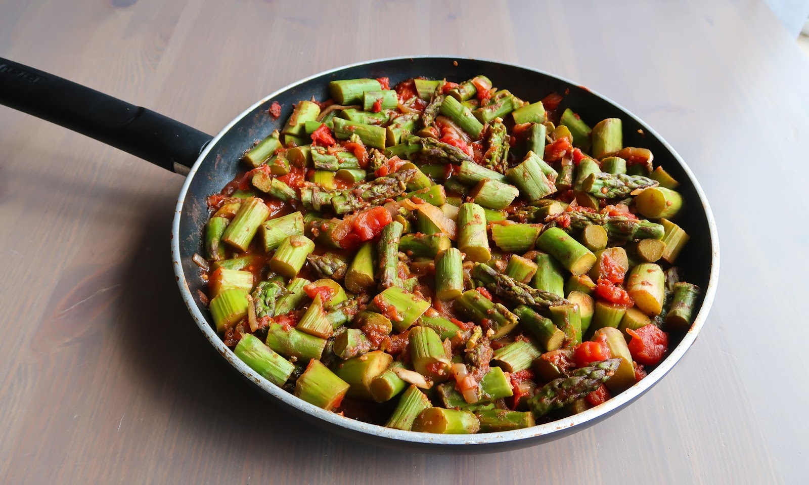 Szparagi umyć, odciąć twarde końce. Następnie pokroić na kawałki wielkości połowy kciuka. Cebulę obrać i pokroić w półksiężyce. Na suchej, rozgrzanej patelni teflonowej "usmażyć" cebulę aż zacznie brązowieć. Lekko posolić. Często mieszać. Jeśli używacie oliwy z oliwek zwyczajnie usmażcie cebulę na oliwie z solą. Jednak kiedy nie chcecie dodawać tłuszczu przyrumienioną cebulę podlejcie niewielką ilością wody, tak aby smak ze spodu patelni się odkleił i by cebula stała się aromatyczna. Czynność powtórzcie kilka razy po czym dodajcie pokrojone szparagi. W tym przypadku również zachowajcie ten sam schemat. Kiedy warzywa lekko przywrą i zaczną nabierać koloru podlejcie wodą by smak odparował. Kiedy szparagi będą al dente dodajcie pomidory, czosnek przeciśnięty przez praskę i doprawcie do smaku solą i pieprzem. Dobrze aby pomidory się trochę zredukowały i nadmiar płynu wyparował.