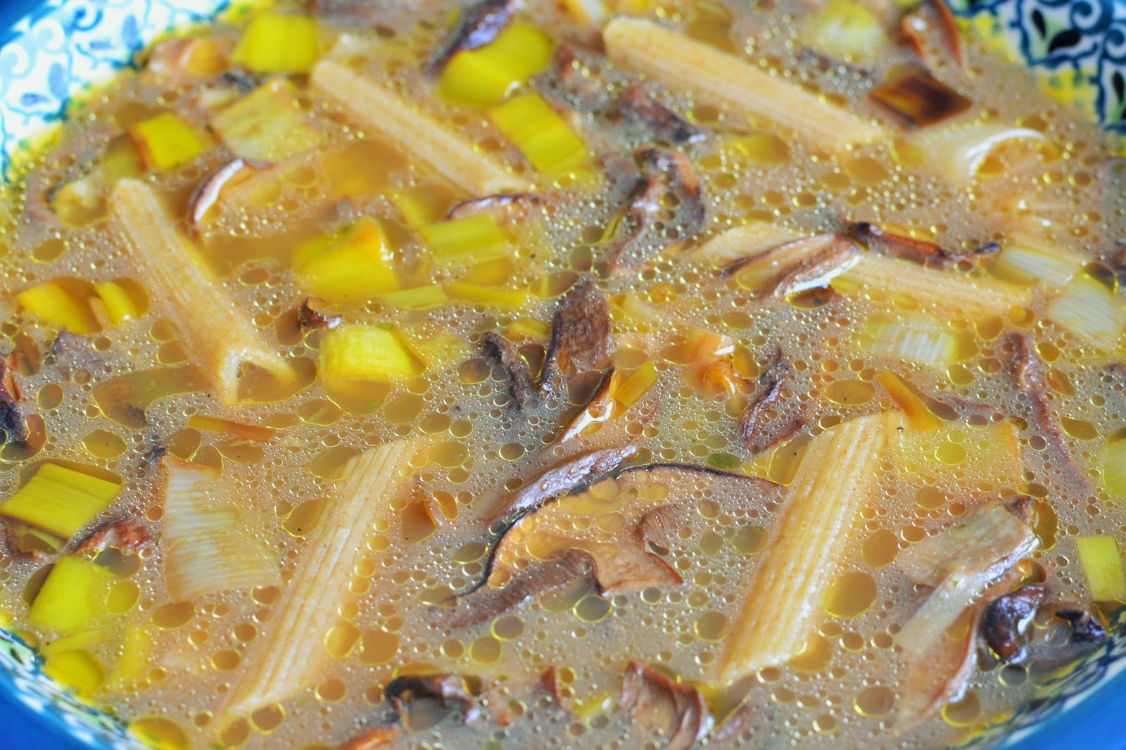 W bulionie zagotować grzyby. Gotować aż zmiękną. Na patelni rozpuścić masło klarowane i usmażyć pokrojone w plasterki jasne części porów. Lekko posolić. Kiedy grzyby zmiękną, do garnka dodać pory z masłem i około pół łyżeczki pieprzu. Zostawić na wolnym ogniu jeszcze na kilka minut. W razie potrzeby doprawić pieprzem. Podawać z makaronem al dente.