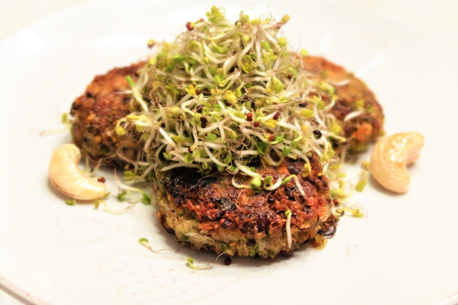 Walentynki zbliżają się wielkimi krokami więc pora pomyśleć nad walentynkowym menu. Najważniejsze aby było smaczne i niezbyt ciężkie. Tak abyśmy mieli siłę na jeszcze inne atrakcje i świętowanie. Dziś mam dla Was super przepis na przepyszne kotlety z kaszy jaglanej, boczniaków, orzechów nerkowca i kiełków. To połączenie smaków, które sprawia, że nasze zmysły dostają szału. Czy może być lepszy początek Walentynkowej kolacji? Kotleciki są lekkie, aromatyczne, o ciekawej strukturze. Kiełki sprawiają, że kotleciki są zwarte zaś ich wartość odżywcza wzrasta milionkrotnie. A poza tym, takie pyszne danie to również świetna okazja do przełamywania schematów. Istnieje przekonanie, że kiełki, natka pietruszki lub inne "zielone" jest niesmaczne i okropne. Otóż moi drodzy, nawet jeśli nie smakują Wam kiełki na kanapce, nie znaczy, że nie posmakują Wam nigdzie indziej. Gwarantuje, że jeśli wypróbujecie ten przepis, nie tylko zaczniecie je jeść nałogowo, ale także zaczniecie je samodzielnie hodować.Serdecznie polecam! Walentynkowe kotlety z kaszy jaglanej, kiełków i orzechów nerkowca: