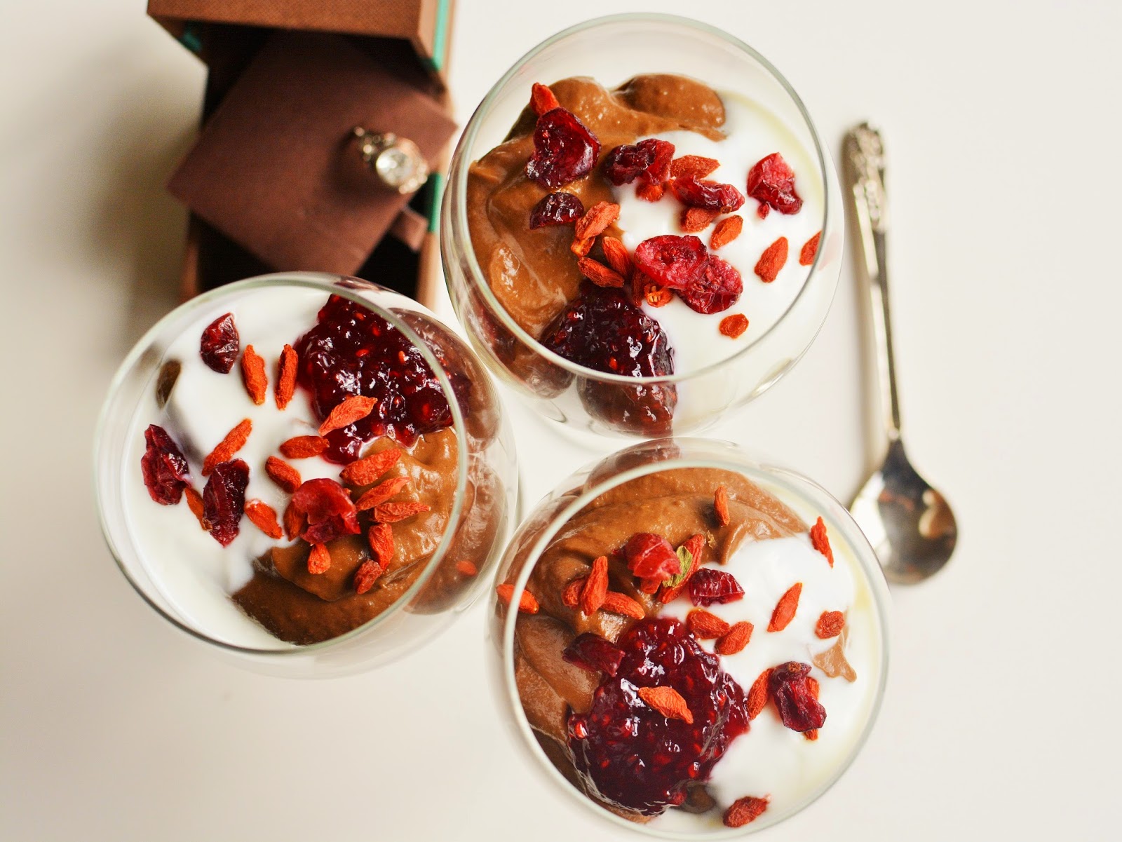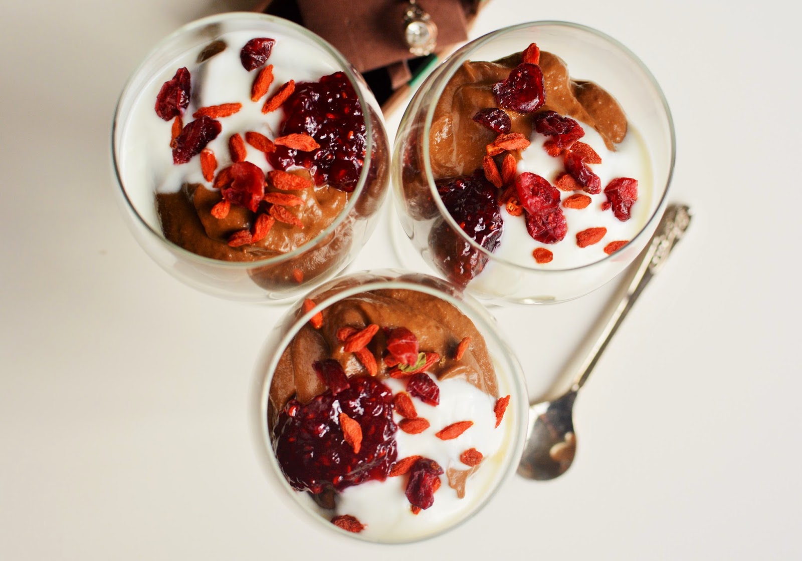 Awokado wydrążyć, banany obrać. Do miksera dodać owoce, masło orzechowe, miód i kakao. Zmiksować na gładką masę. Nakładać do kieliszków. Następnie dodać łyżkę jogurtu, łyżeczkę konfitury i posypać wedle preferencji: żurawiną, owocami goji, prażonymi orzechami lub pestkami.