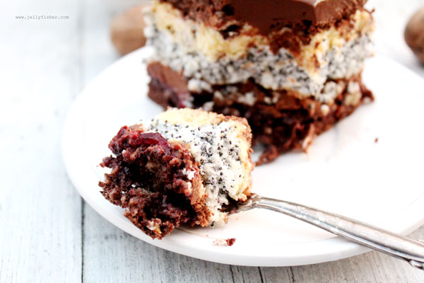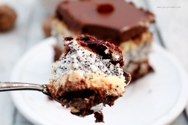Przykrywam plackiem kokosowo-makowym, smaruję go białą masą.