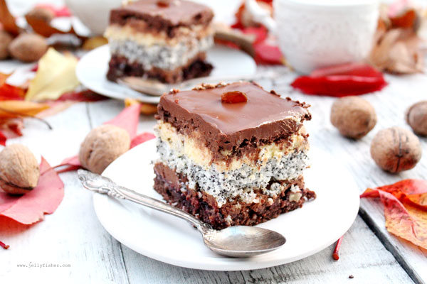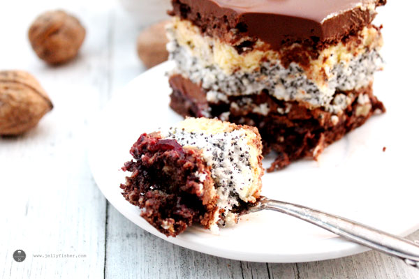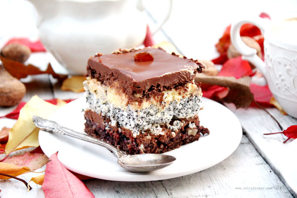 Z plackami z orzechów, wiórek kokosowych i maku, oraz z masą budyniową klasyczną i czekoladową i dżemem (można pominąć).