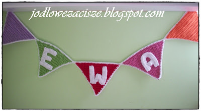 Witajcie,tym razem spod szydełka wyszła girlanda z imieniem mojego synka. Trójkąty w ulubionych kolorach zawisły nad łóżkiem :)