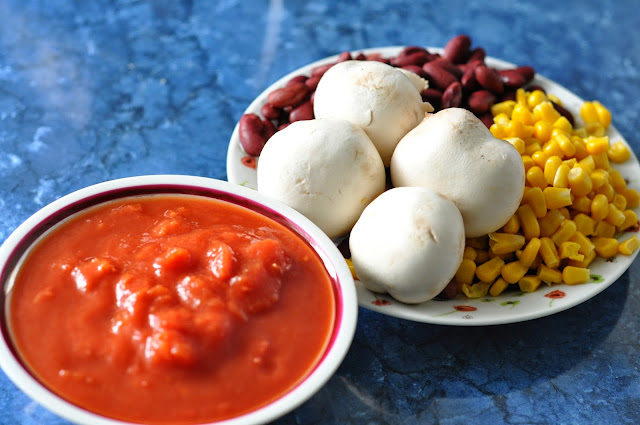 Tortillowy weekend trwa w najlepsze - dzisiaj druga odsłona, tym razem z pieczarkami i czerwoną fasolą. Podobnie danie jadłam parokrotnie w wegetariańskim Green Wayu (pod nazwą Enchilada) i stąd właśnie wzięłam na nie inspirację.