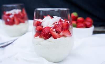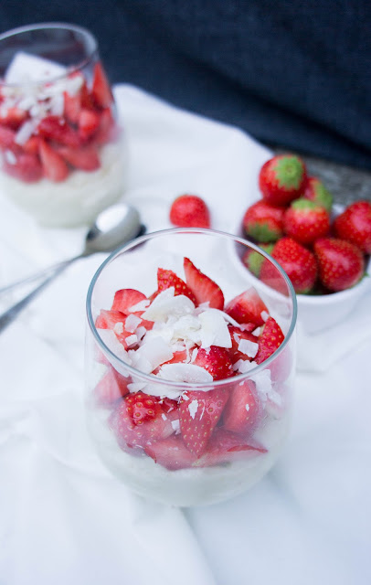 Na wierzchu ułóż truskawki i płatki kokosa.