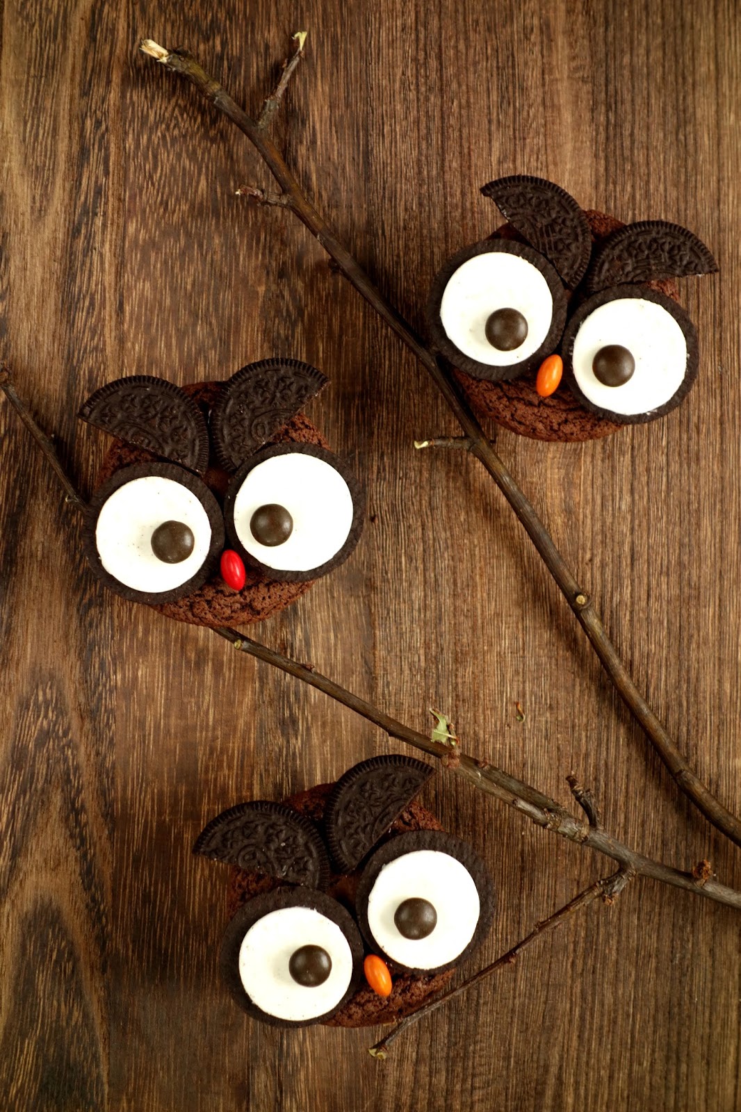 Popularne babeczkowe sowy, udekorowane czekoladowymi ciasteczkami i drażetkami. Są bardzo proste i szybkie w przygotowaniu. Najwięcej pracy zajmie upieczenie babeczek. Najlepiej upiec za jednym razem większą ilość ulubionych babeczek czekoladowych a następnie udekorować je w różny sposób. Z braku czasu ja tak zrobiłam. Zresztą mam sprawdzony przepis z którego babeczki równo rosną i nie trzeba ścinać ich wierzchołków. A żeby babeczki wyglądały jak sowy, potrzebna jest płaska powierzchnia do której należy przymocować wszystkie elementy. Takie ciasteczkowe sowy spodobają się wszystkim dzieciom i można je przygotować na różne okazje, nie tylko na Halloween. Polecam.