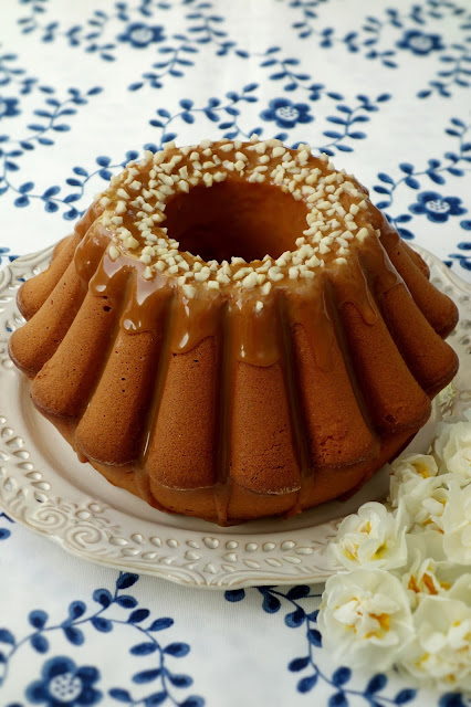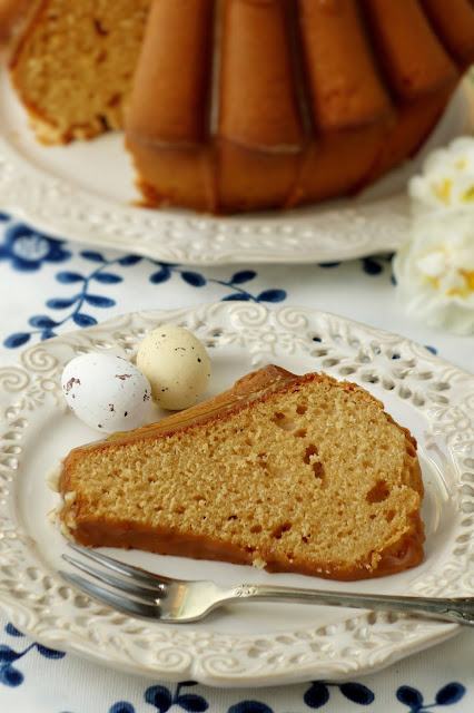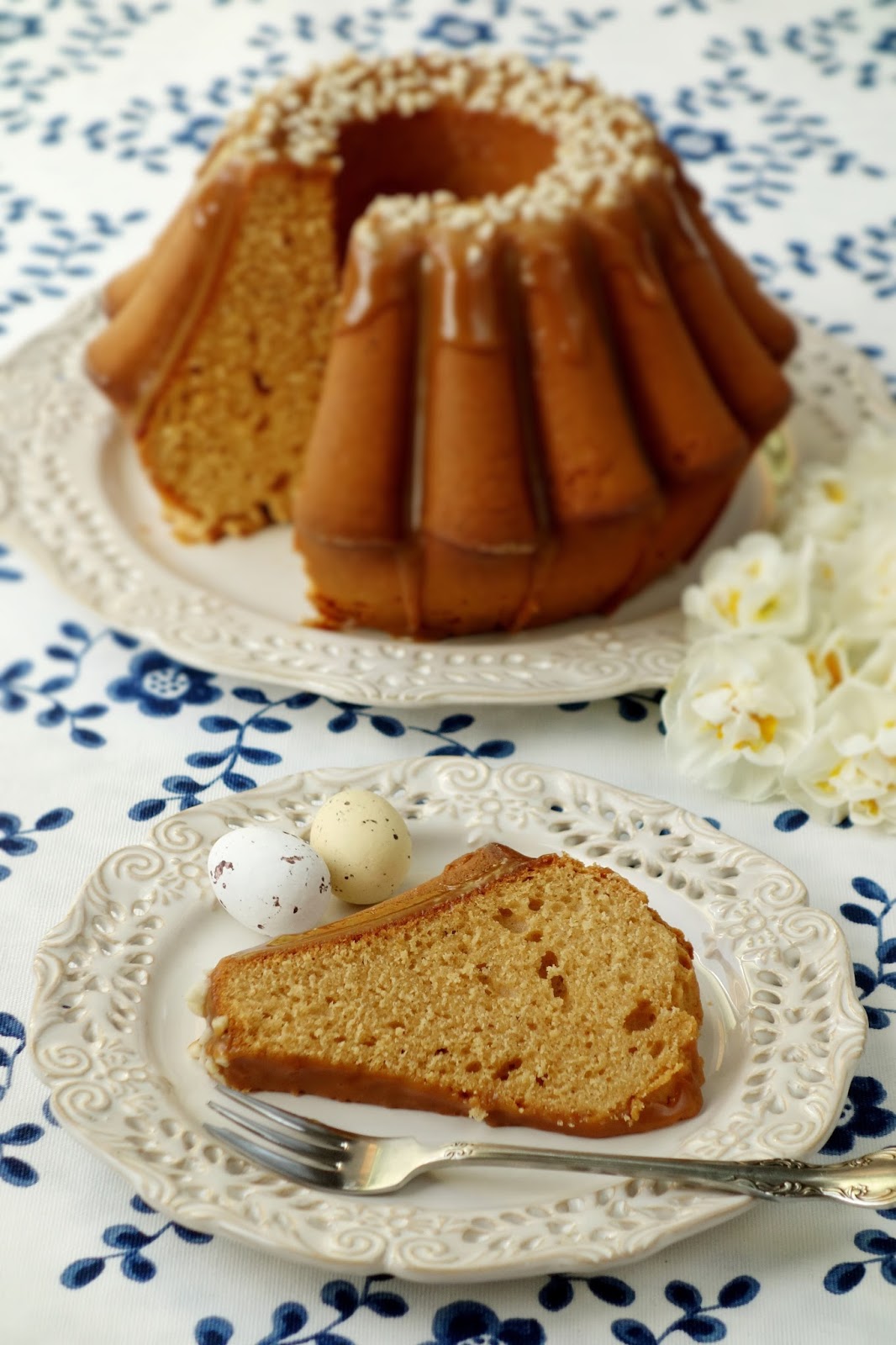 Babka o cudownym kajmakowym smaku i zapachu. Kolorem przypominająca bursztyn. Dosyć ciężka, ale przy tym również puszysta i wilgotna. Udekorowana sosem kajmakowym i orzeszkami. Moje ulubione smaki. Nie ma nic lepszego. Na pewno zasmakuje każdemu miłośnikowi masy kajmakowej. Będzie pięknie prezentować się w towarzystwie wielkanocnych mazurków. Polecam bardzo serdecznie.