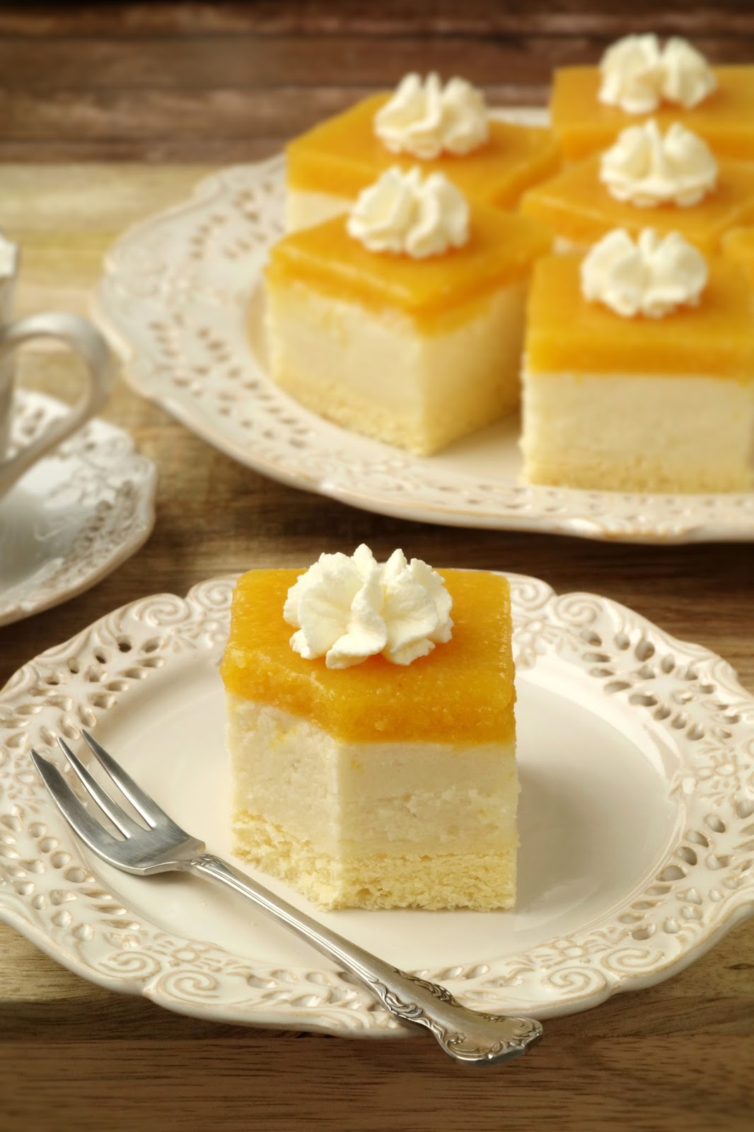 Brzoskwinie wyjąć z syropu i zmiksować za pomocą blendera. Gdyby masa była za gęsta i za sucha, można dodać do niej odrobinę syropu z puszki. Żelatynę rozpuścić w gorącej wodzie, wystudzić i przelać do zmiksowanych brzoskwiń. Całość dokładnie wymieszać, wylać na krem i wstawić do lodówki na kilka godzin a najlepiej na całą noc. Wierzch ciasta można udekorować bitą śmietaną . Przechowywać w lodówce do czasu podania.