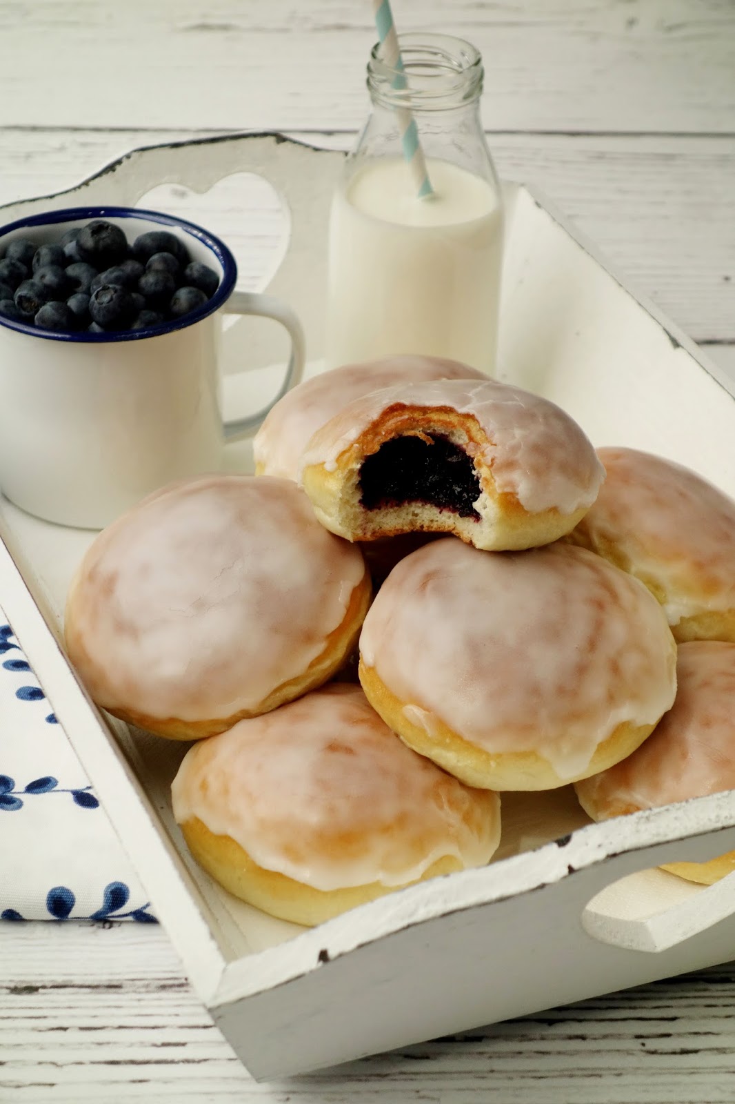 Kolejny przepis na drożdżowe jagodzianki, ale tym razem z lukrem. Kształtem przypominają pączki. Są równie delikatne i puszyste dzięki dużej ilości żółtek w cieście. Przepyszne i wypełnione po same brzegi nadzieniem jagodowym. Jak każde drożdżówki są łatwe do przygotowania ale zajmuje to dużo czasu. Drożdżówki można zamrozić po upieczeniu, ale nie mogą być polukrowane.