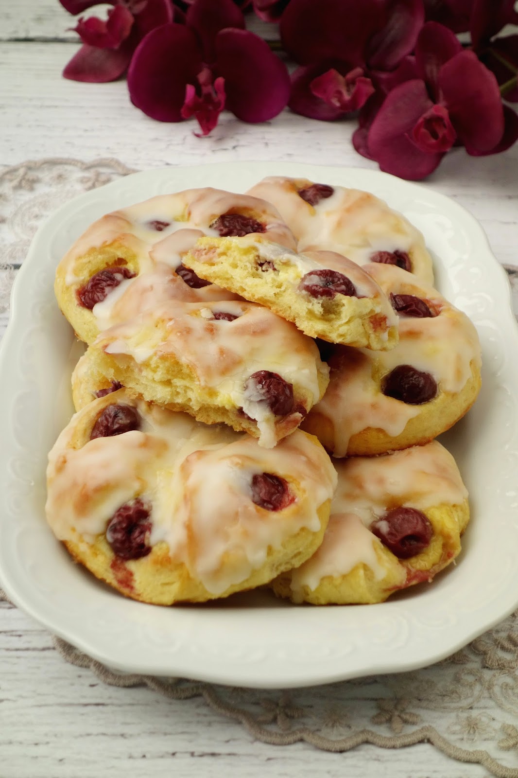 Całość: ciasto wyjąć z lodówki, rozwałkować na duży kwadrat o grubości 1 cm, lekko podsypując mąką i podzielić na 18 równych części. Na środek każdego kawałka nałożyć 1 łyżkę kremu i 4 wiśnie. Chwycić za każdy narożnik, złożyć do środka i zlepić ze sobą na samym środku tak aby wiśnie pozostały widoczne w małych szczelinach. Przełożyć na dwie blachy wyłożone papierem do pieczenia, zachowując duże odstępy pomiędzy każdą bułeczką. Nakryć ściereczką i odstawić do wyrośnięcia na 1-1,5 godziny. Po tym czasie każdą bułeczkę posmarować roztrzepanym jajkiem i wstawić do piekarnika nagrzanego do 200ºC bez termoobiegu. Piec na złoty kolor przez 15 minut. Gotowe wyjąć z piekarnika, wystudzić i udekorować cukrem pudrem lub lukrem.