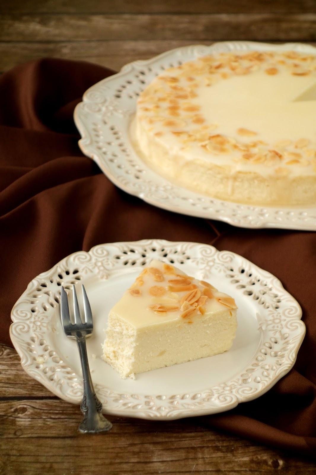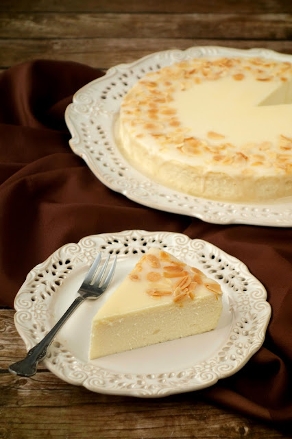 Bardzo prosty i smaczny sernik, idealny na zbliżające się święta wielkanocne. O wyraźnym migdałowym smaku. Do masy serowej warto dodać podprażone płatki migdałowe. Ja z nich zrezygnowałam, ponieważ ilość jaką miałam w domu starczyła tylko do dekoracji sernika. Tak czy inaczej sernik jest bardzo dobry i oryginalny w swym smaku. Udekorowany lukrem i prażonymi migdałami. Będzie pięknie prezentował się na świątecznym stole wśród babek i mazurków. Polecam bardzo serdecznie.
