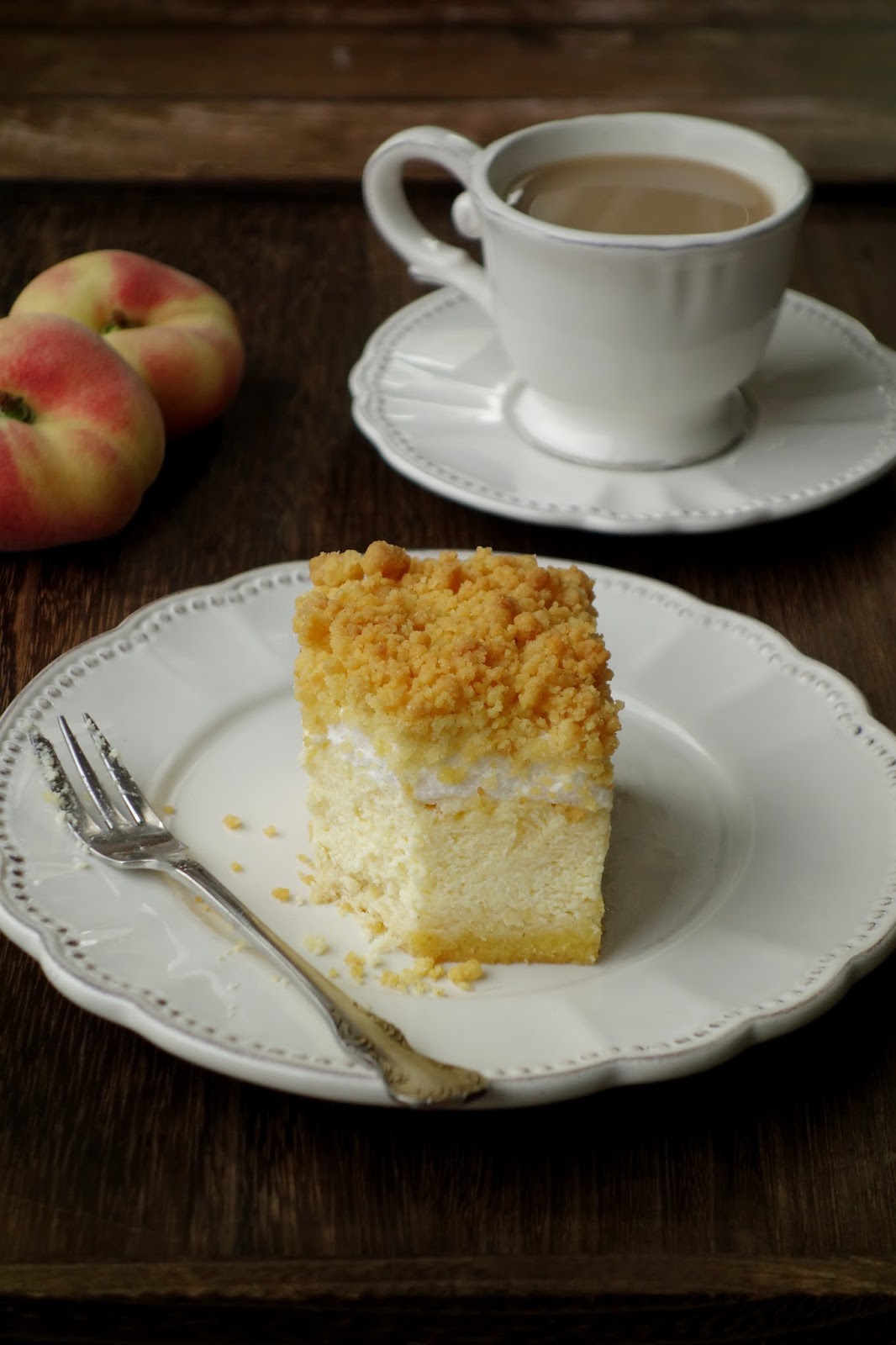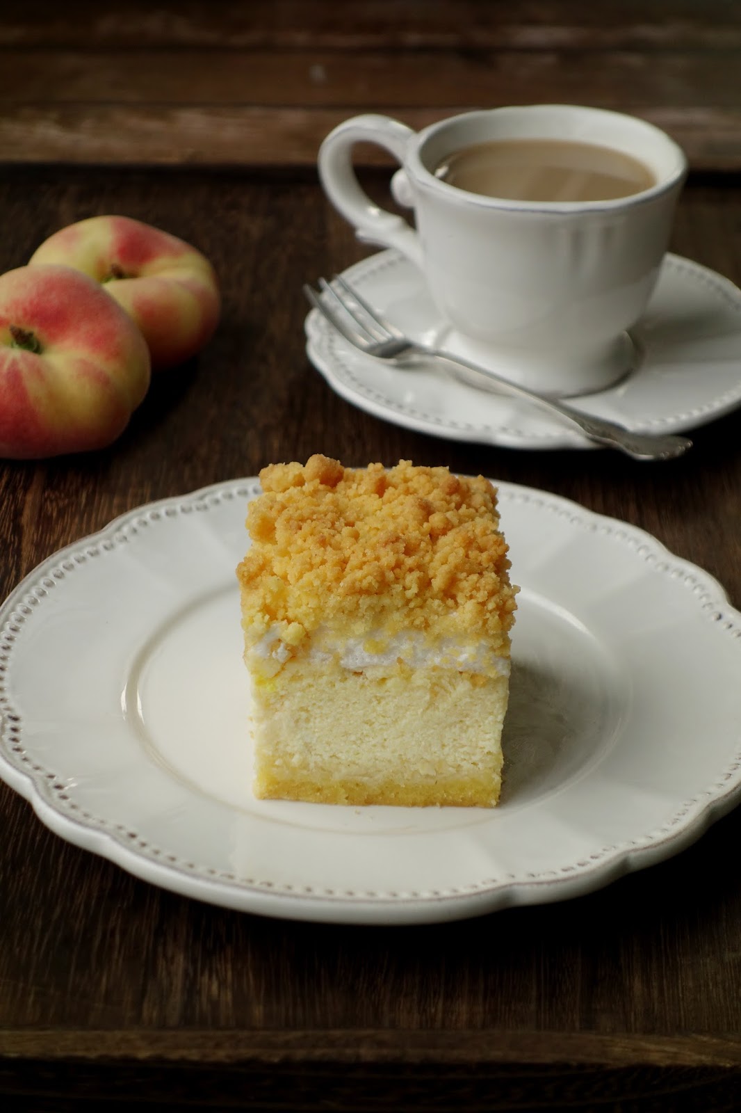 Przepyszny sernik na kruchym spodzie z dużą ilością brzoskwiń, pianki bezowej i kruszonki. Niestety składa się z kilku warstw przez co jest trochę pracochłonny, ale na szczęście każdą warstwę wykładamy na blachę, jedną na drugą i wstawiamy do piekarnika. Sernik wychodzi idealny. Bez zakalca i nierównego opadania. Polecam bardzo serdecznie.